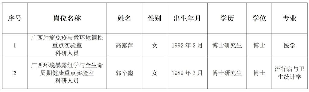 根据桂林医学院2024年招聘计划,经资格审查、考试考核、政审和体检,拟聘用高露萍、郭辛鑫到相应岗位工作,现将拟聘用人员基本情况予以公示,公示期为5日(2024年12月25日至2024年12月29日)。