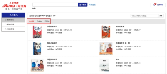 4、我的荐购:【个人中心】→【我的荐购】中可查看到所有的荐购书目,及图书馆的采纳情况。