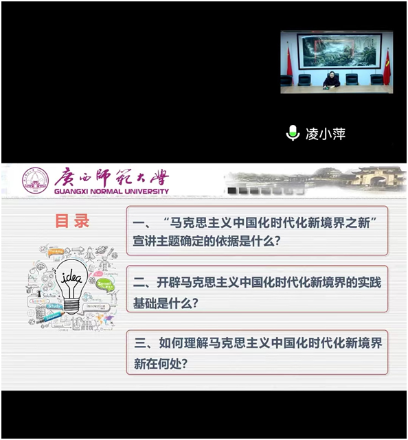 凌小萍以“马克思主义中国化时代化新境界之新 ”为主题,紧紧围绕“‘马克思主义中国化时代化新境界之新’宣讲主题确定的依据是什么?”“开辟马克思主义中国化时代化新境界的实践基础是什么?”“如何理解马克思主义中国化时代化新境界新在何处?”等三个方面,对党的二十大精神作了深入阐释和系统解读。整场报告会主题鲜明、重点突出,内容丰富、深入浅出,既有理论上的深刻感悟,又有实践中的提炼升华,具有很强的思想性、理论性和指导性,为我校师生进一步准确理解把握和贯彻落实党的二十大精神提供了精准辅导和有力指导。