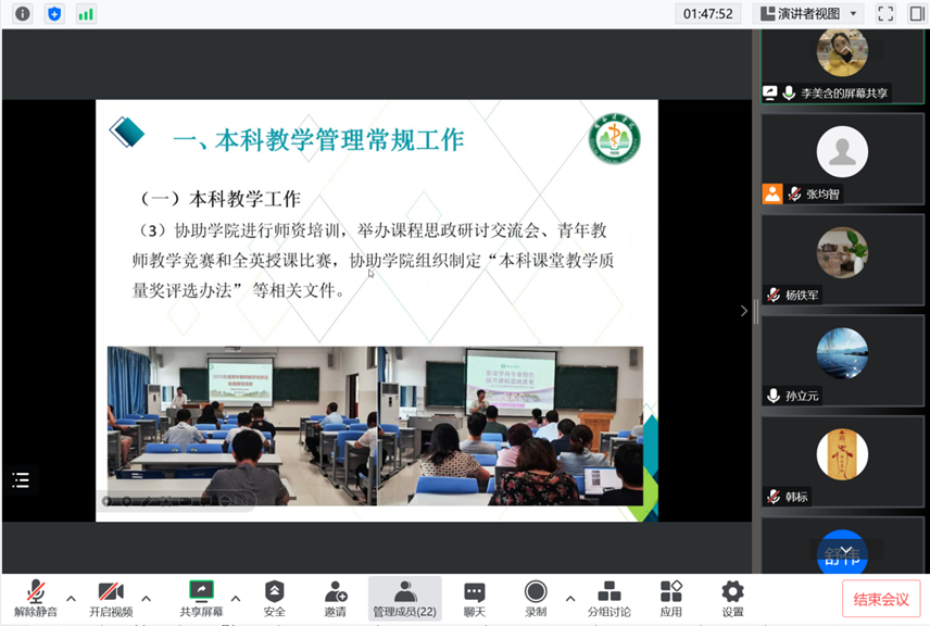 会上,各教研室、实验教学中心负责人分别围绕2022年基本教学工作完成情况、教学改革进展、教研室管理与运行、科学研究、协助学院专项工作、存在不足与改进措施及2023年工作设想等方面作详细的汇报。随后,分管本科教学工作和研究生教学工作的副院长、教学管理人员分别作个人工作汇报。