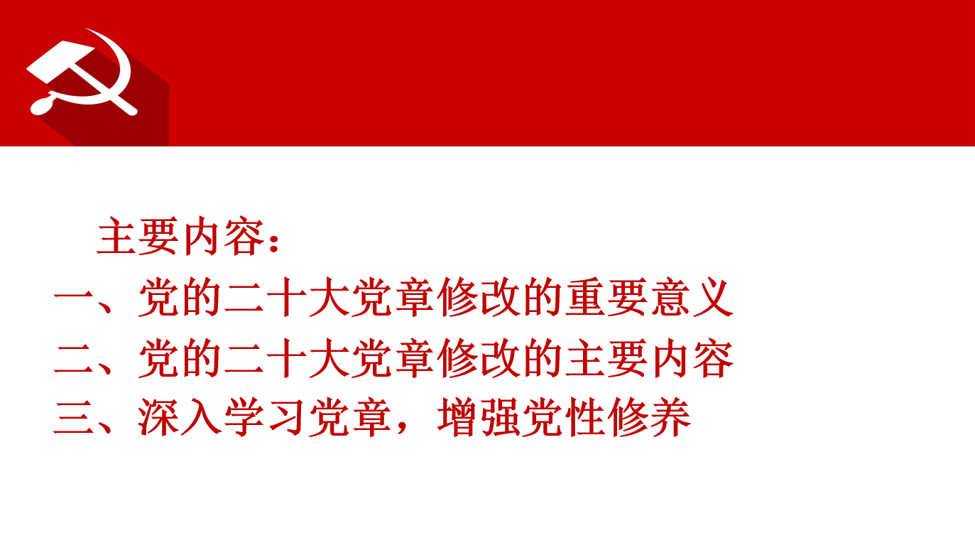 党课伊始,黄月圆带领党员学习习近平总书记关于党章的重要论述。随后,她围绕“党的二十大党章修改的重要意义”、“党的二十大党章修改的主要内容”、“深入学习党章,增强党性修养”等三个方面进行深入解读,并提出学习贯彻党的二十大党章的实践要求:全面贯彻习近平新时代中国特色社会主义思想;坚持“两个确立”,做到“两个维护”;坚定理想信念,守正创新,团结奋进;争当新时代共产党人楷模,发挥支部战斗堡垒作用。