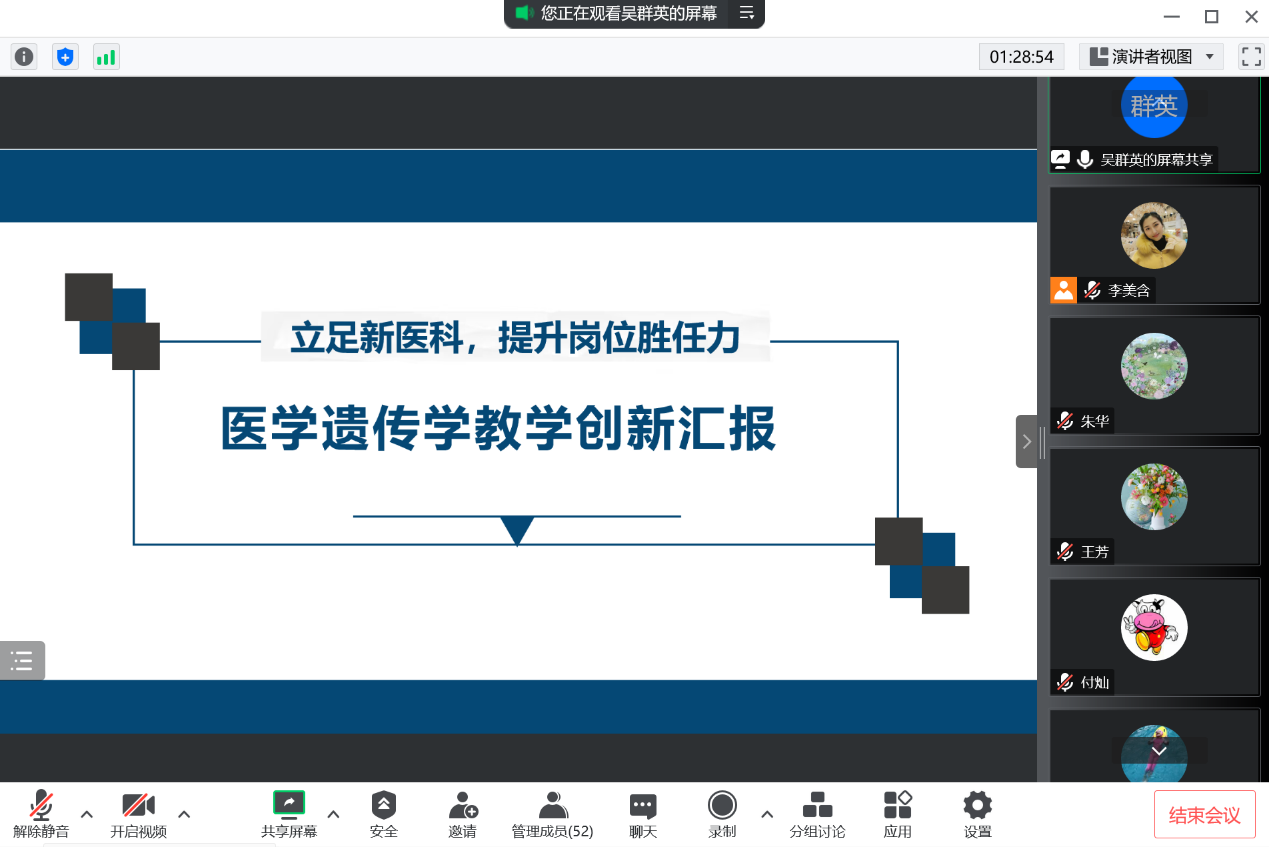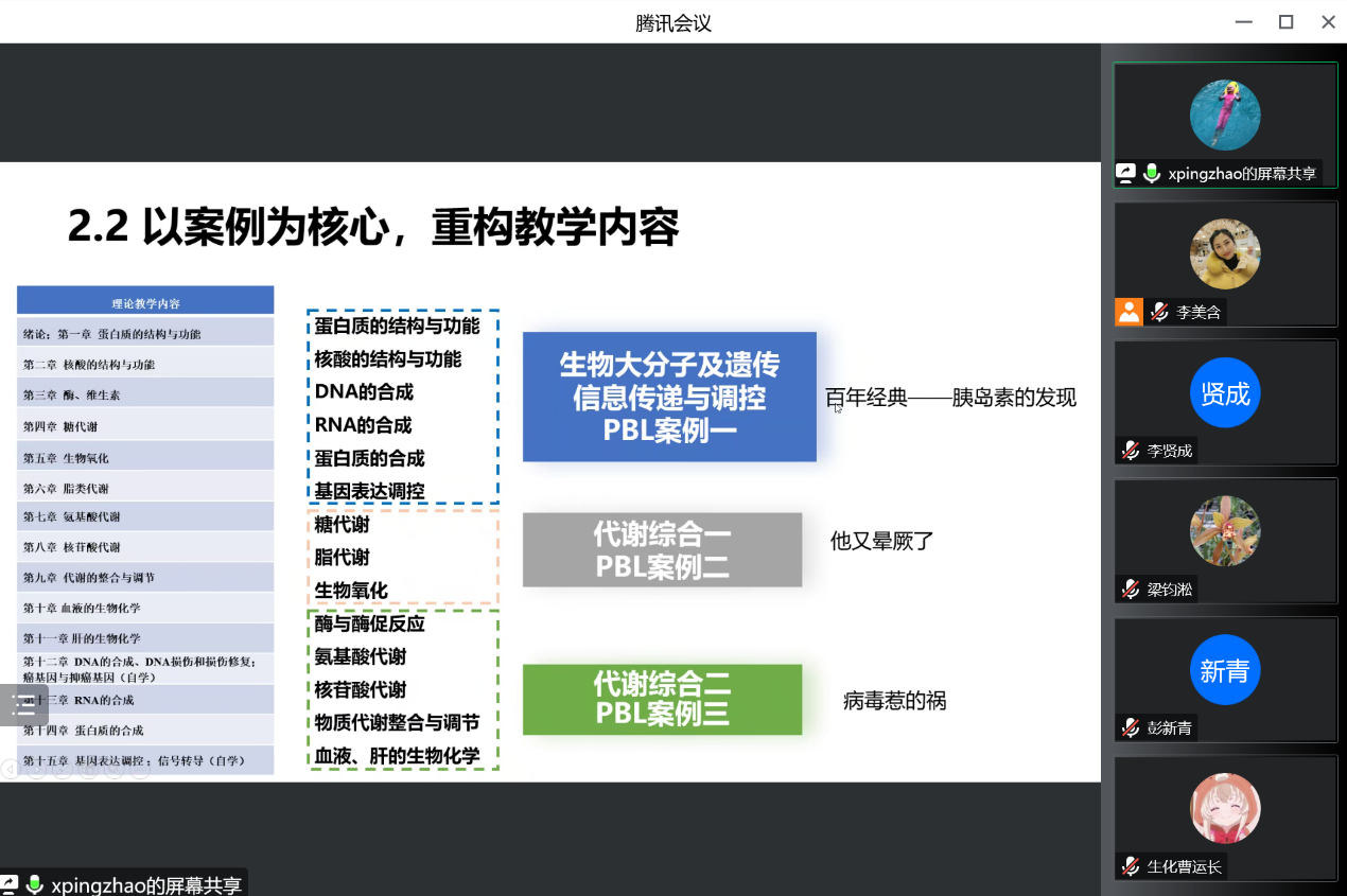 培训会上,生物化学教研室赵晓平老师做了题为“生物化学与分子生物学教学创新成果报告”,从教学改革创新的目标、特点及痛点分析、PBL教学手段等方面阐述了教学改革创新设计思路。细胞与遗传学教研室吴群英老师做了题为“立足新医科,提升岗位胜任力—医学遗传学教学创新汇报”,介绍了课程概况、学情和痛点、教学创新、教学考评、创新特色、成果辐射等方面内容。本院教学创新竞赛国赛、区赛获得者付灿副教授、肖福英教授、朱华副教授进行线上指导。他们分享了参加教学创新竞赛的经验,分别从案例的选取、模型的构建、课程教学设计等方面为给予了切实可行的建议。参与培训的专任教师对两位教师的教学创新方案进行了热烈的讨论。