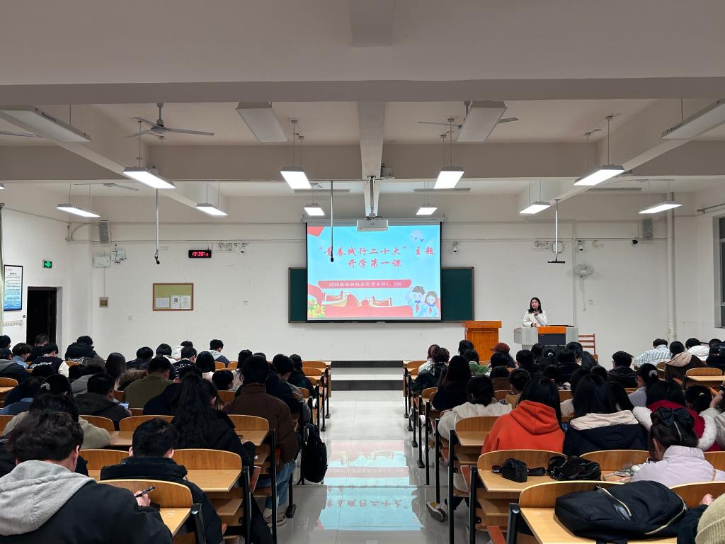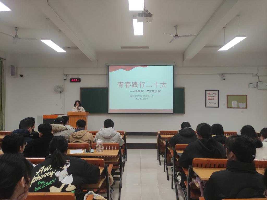为让学生进一步了解我国三年抗疫的巨大成就,深入学习党的二十大精神,增强学生安全防范意识,稳定学生在后疫情时代的心理健康,临桂临床医学院各班级于2月19日晚上在临桂校区教学楼召开“青春践行二十大”开学第一课主题班会。