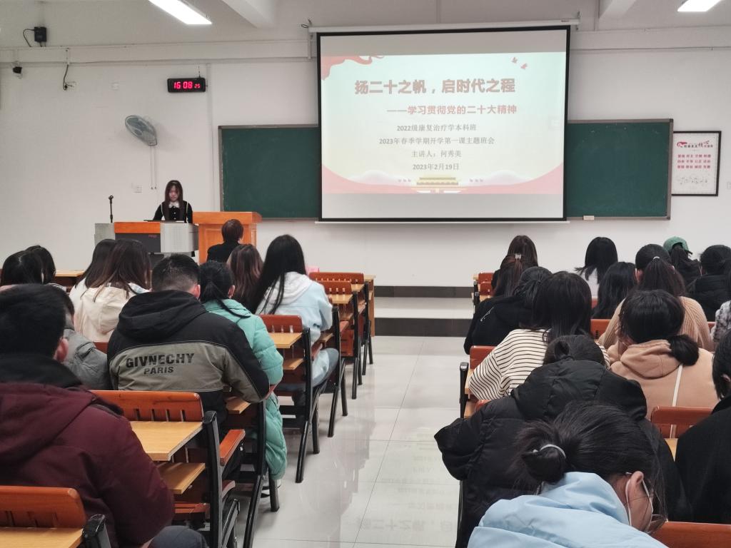 为贯彻落实我校2022-2023学年春季学期开学各项工作要求,确保顺利开学,2月19日下午,康复医学系在东城、临桂两个校区开启2022-2023年春季学期“开学第一课”活动。系副主任许玲、学生工作办公室主任及相关教师到场授课,2020、2021、2022级康复治疗学专业全体学生参加。