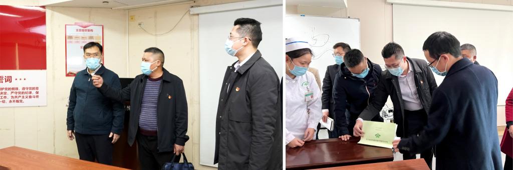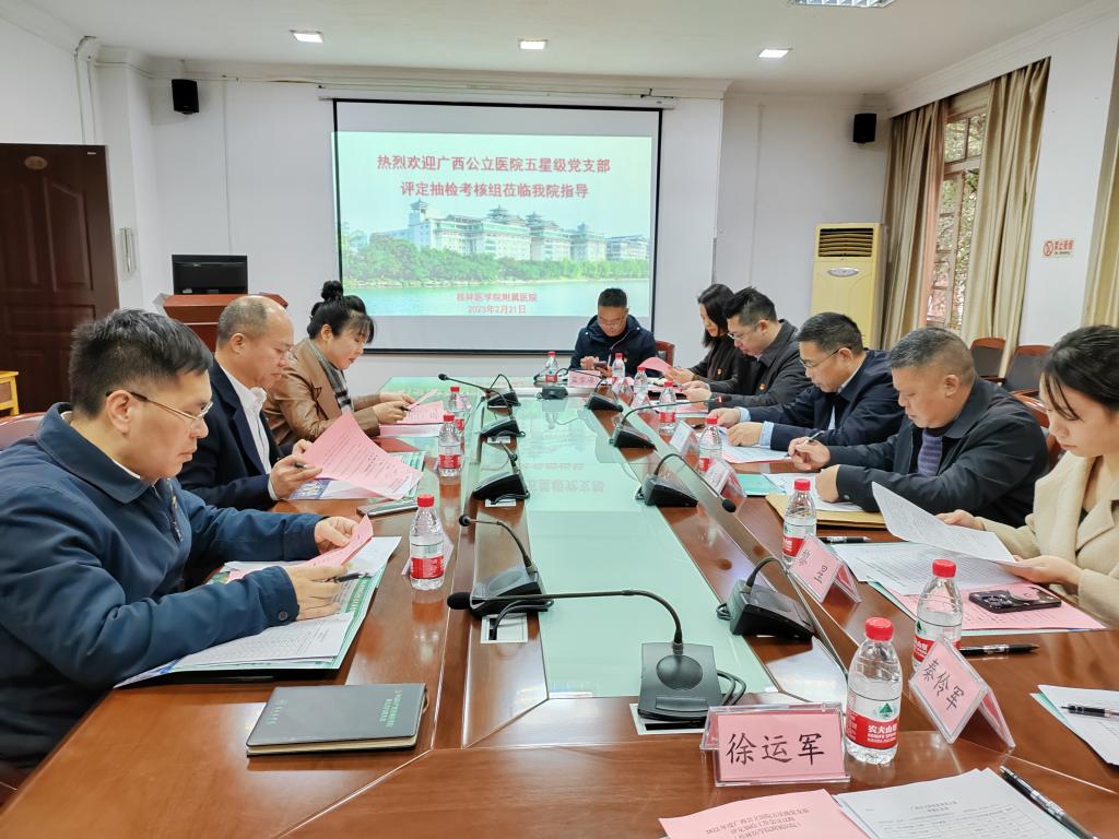 2月21日下午,自治区卫生健康委医政医管处处长吴才林,广西医科大学附属武鸣医院党委副书记、纪委书记潘文海一行五人组成的星级党支部评定考核专家组,到附属医院开展五星级党支部评定检查工作。附属医院党委书记覃克强,党委副书记、院长汪丽燕,党委副书记、纪委书记滕若冰及相关工作人员陪同检查。