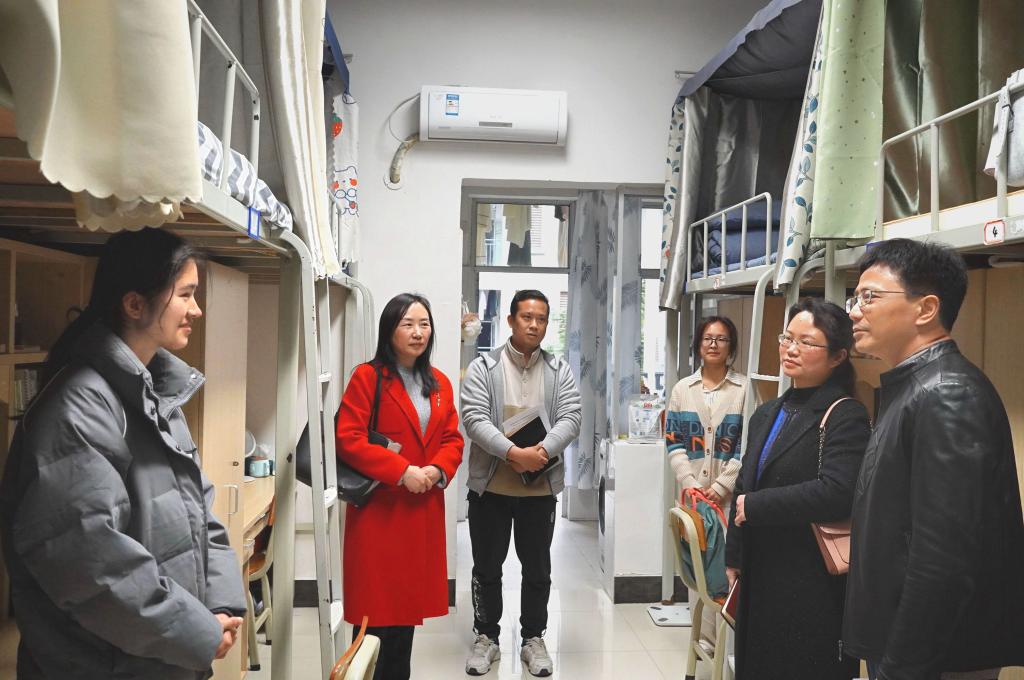 学院党委书记秦媛、院长高燕、党委副书记谢勇志、学工团委老师首先来到学生公寓,走访看望学生,为同学们送去关怀和慰问。老师和学生亲切交谈,询问他们在学习生活上遇到的问题和困难,关心了解学生的心理状态、思想动态和学习情况,分析掌握广大学生所需所想所愿。