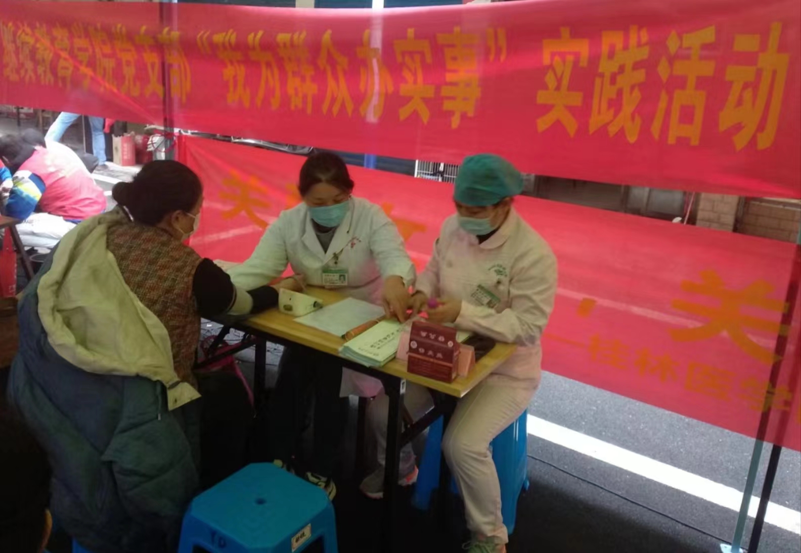 近期,继续教育学院组织党员、志愿者走进桂林市象山区银锭社区,为社区居民进行血压监测、中医理疗、孕产妇保健知识宣教等义诊活动,此次活动,发放培训项目简介单60余份,解答社区居民疑问60余人次,受到社区和居民的好评。