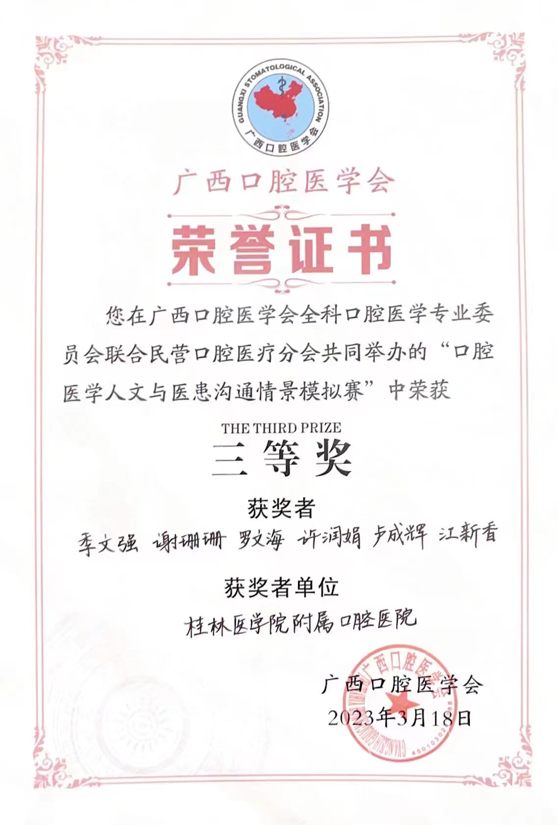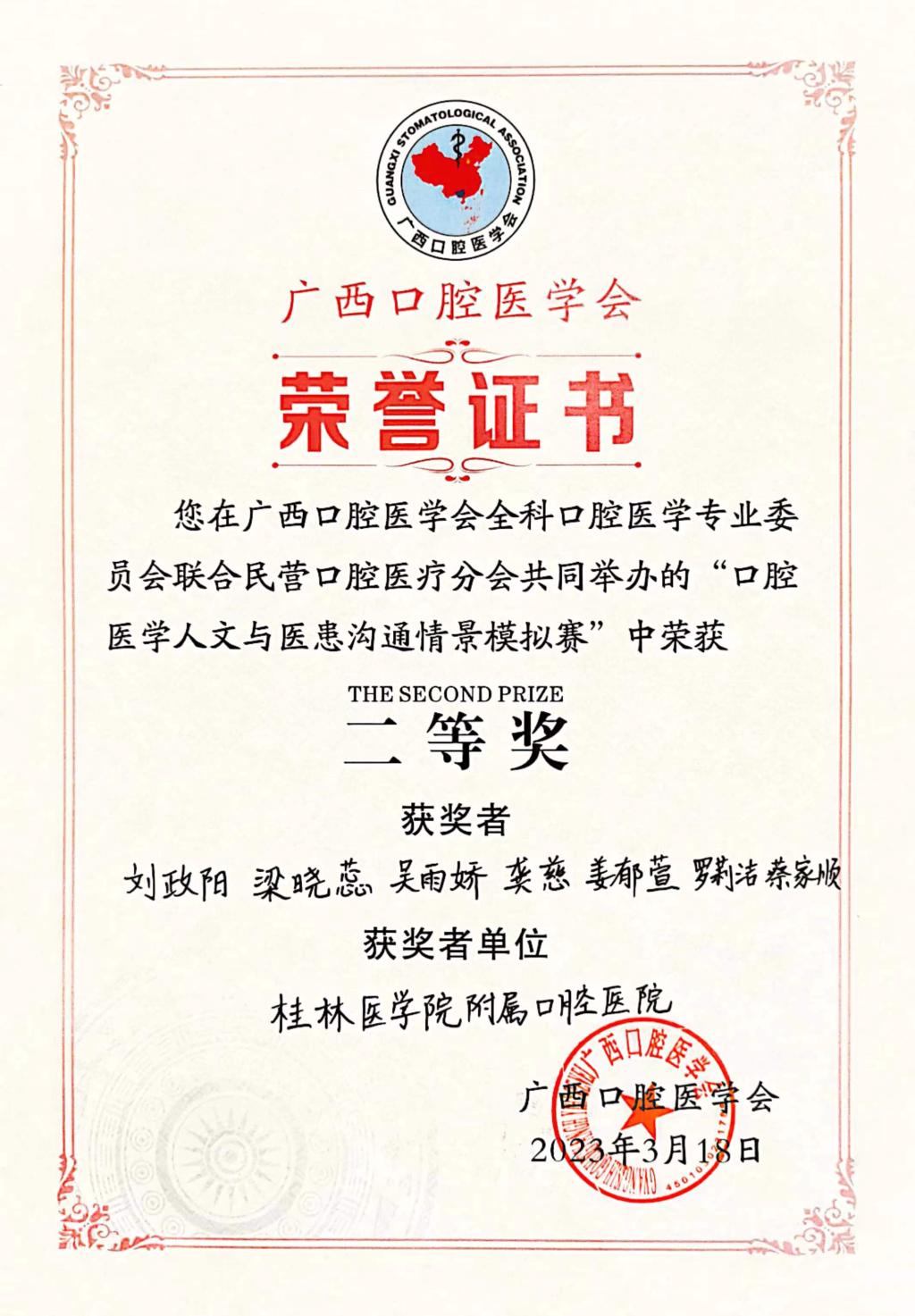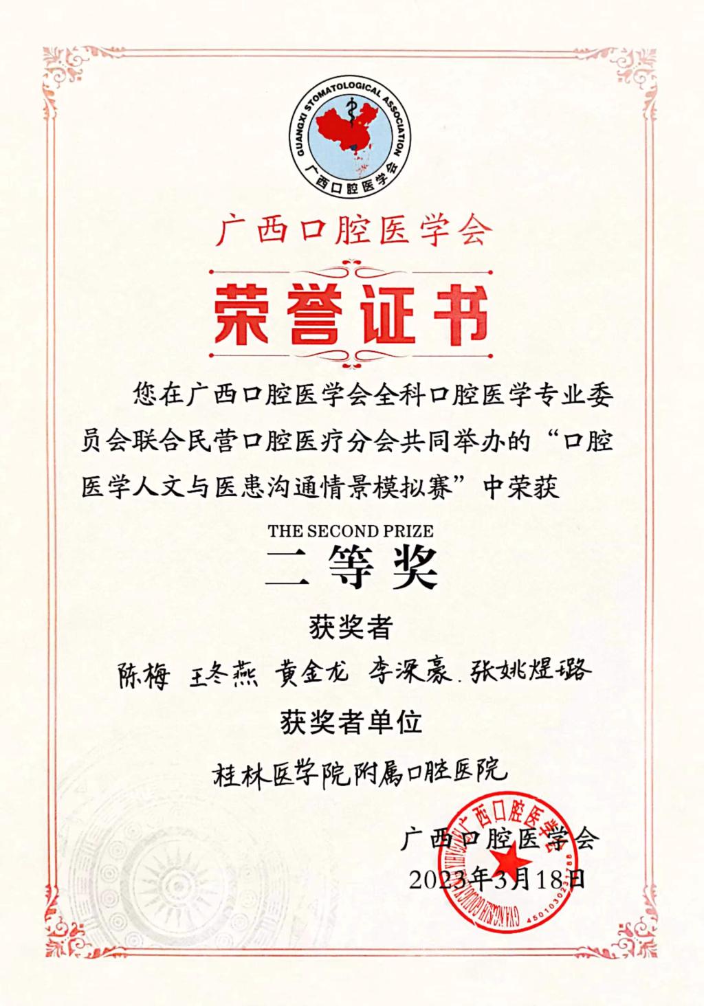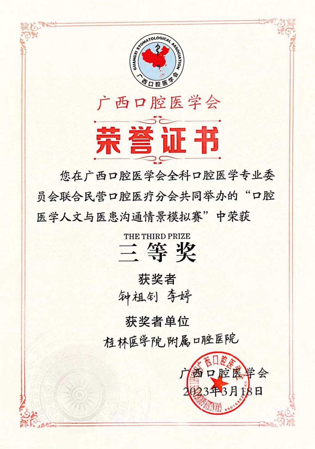 3月18日,由广西口腔医学会全科口腔医学专业委员会及民营口腔医疗分会共同举办的口腔医学人文与医患沟通情景模拟赛在南宁落下帷幕,我校附属口腔医院报送的5项作品获得佳绩。