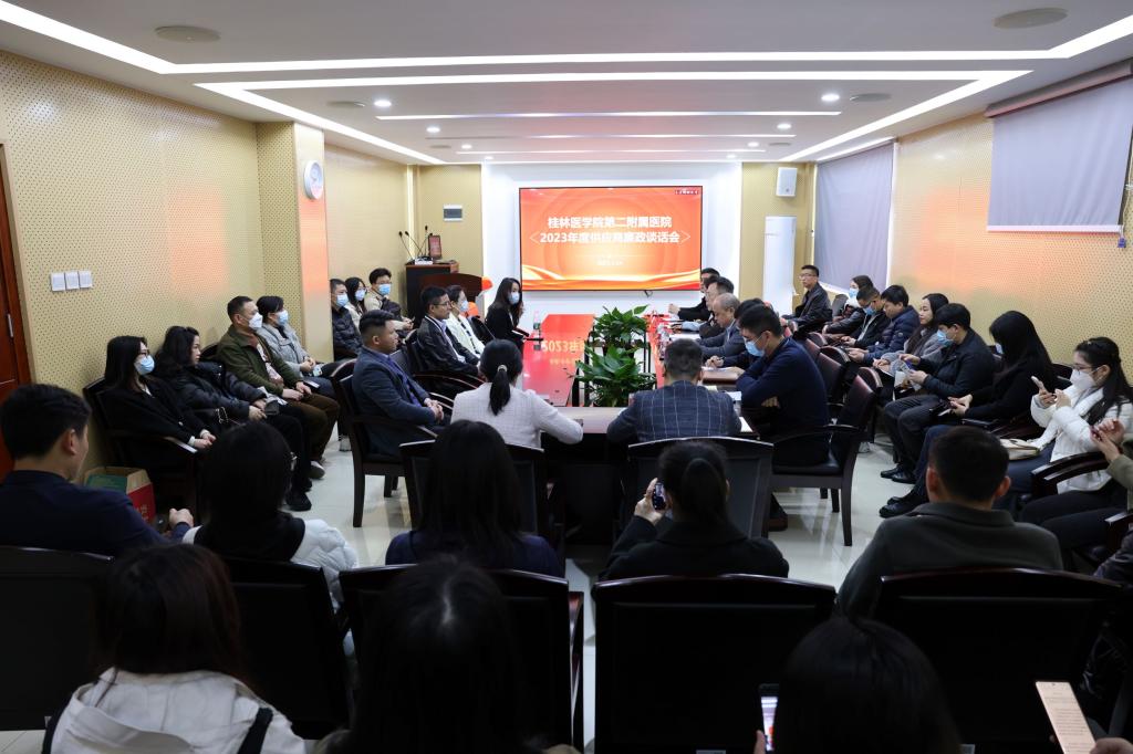 为贯彻落实二十届中央纪委二次全会和自治区纪委十二届三次全会精神,进一步推进清廉医院建设,规范医院医药产品购销行为,切实抓好医院在医疗器械、耗材物资采购、基建工程项目等方面的廉洁风险防控工作,3月24日上午,医院党委书记葛波,党委副书记、纪委书记彭鹏组织开展桂林医学院第二附属医院供应商集体廉洁谈话,医院纪委监察室、招标管理科、设备科、药学部、基建科、后勤管理部等部门负责人及供应商代表共50余人参会。会议由彭鹏主持。