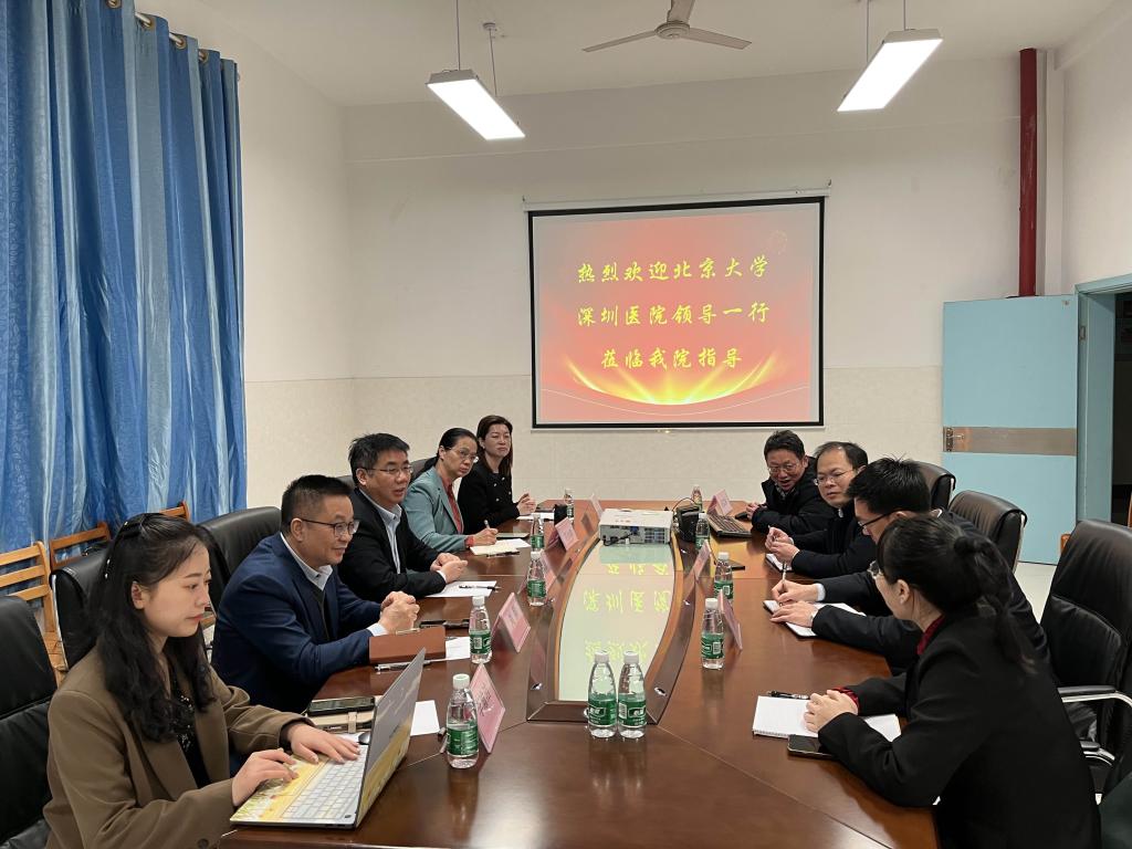 石武祥对北京大学深圳医院一行的到访表示热烈欢迎,他介绍了学院的发展现状和特色,重点介绍了医校合作、学院研究生教育、本科及研究生实习情况,并希望在学生就业等方面进一步深入合作。赵永胜介绍了北京大学深圳医院的发展现状、重点介绍了医院的科研教学成果、研究生导师指导研究生、实习生实习科室轮转情况,对学院人才培养的质量给予了充分肯定,并表示会在现有医校合作的基础之上,加强优质研究生导师的培养和输出、加强学生实习管理,鼓励医院与学院之间形成更密切的合作。北京大学深圳医院护理科丁小容主任介绍了学校护理专业实习生在医院的实习情况。与会人员展开了热烈的交流。
