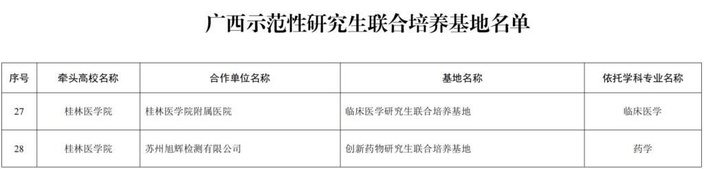 近日,广西壮族自治区学位委员会自治区教育厅下发了《关于公布一批广西示范性研究生联合培养基地名单的通知》,“创新药物研究生联合培养基地(合作单位:苏州旭辉检测有限公司)”获批为广西首批示范性研究生联合培养基地。