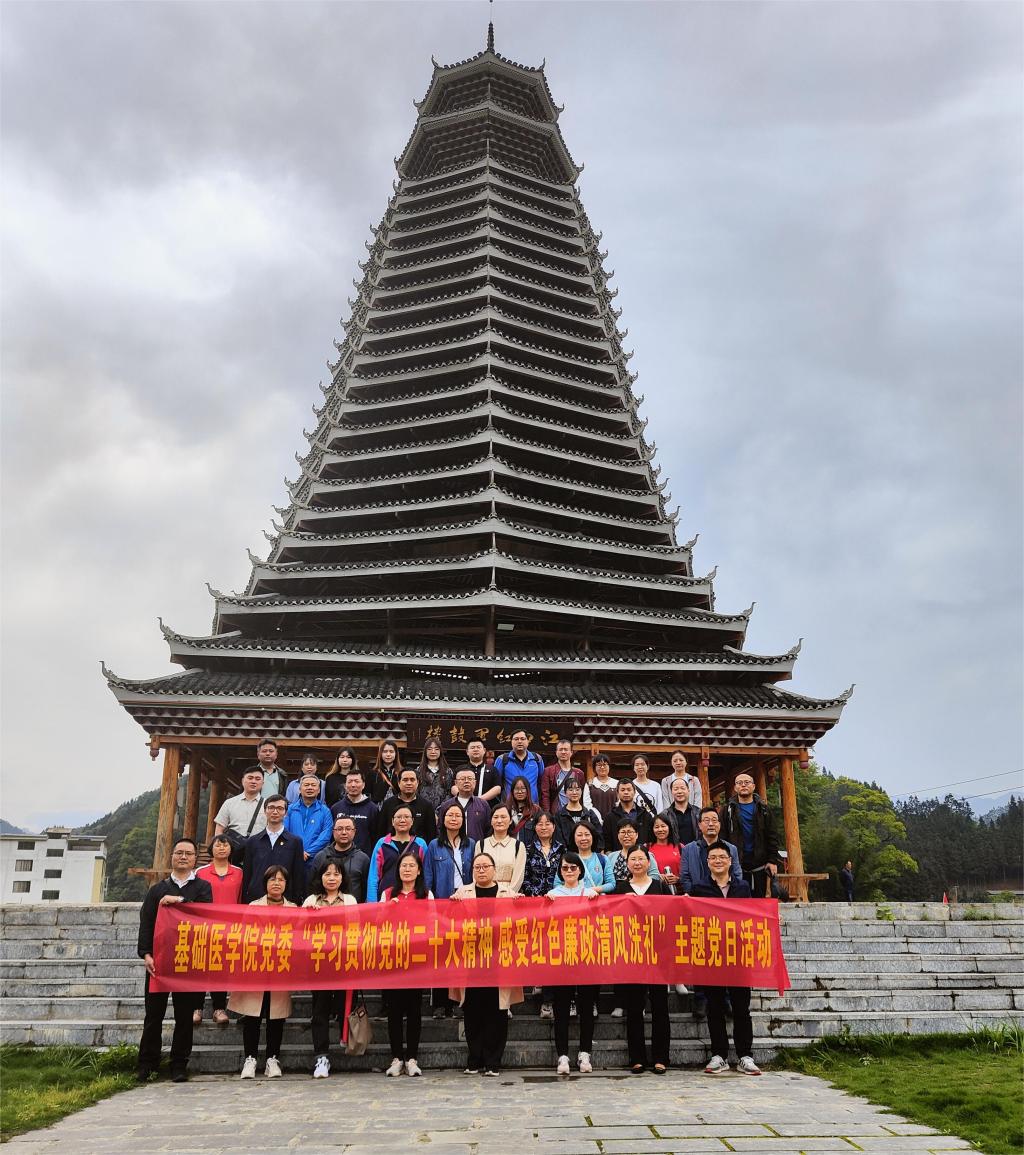 为深入学习贯彻党的二十大精神,推动党史学习教育常态化长效化,不断汲取开拓前行的智慧和团结进步的力量,4月15日,基础医学院党委组织党员同志赴龙胜江口红军长征战役纪念地开展主题党日活动。一条山坳地域开阔,乐江镇江口村位于龙胜县东部山地中心,乐江河与江口河在此交汇,也是军事防御要塞。89年前,无数革命先烈抛头颅洒热血,在这里英勇献身。而今,在这块浸染红军先烈热血的土地上一栋雄伟的侗族红军鼓楼庄严肃穆地矗立着。鼓楼前迎风飘荡的油菜花海仿佛仍在向后来的人们讲述着那段可歌可泣的历史。广场两侧的展板分别记述着红三军团江口河口阻击战的战斗场景,旁边纪念室内,一张张生动的图片、一件件珍贵的遗留实物,完整地记录着红军在江口浴血奋战的历史。纪念室已成为人们缅怀革命先烈、进行爱国主义教育和革命传统教育的重要场所。在那黎明前的黑暗中,理想信仰如长明不息的火炬,指引着红军战士们前进的方向。
