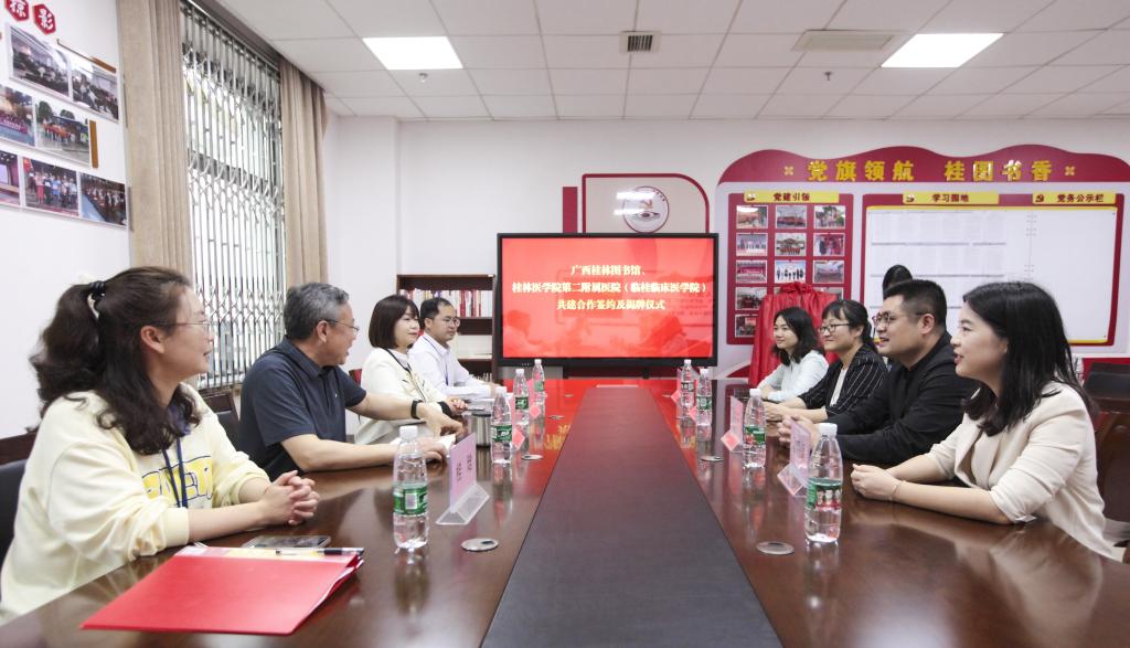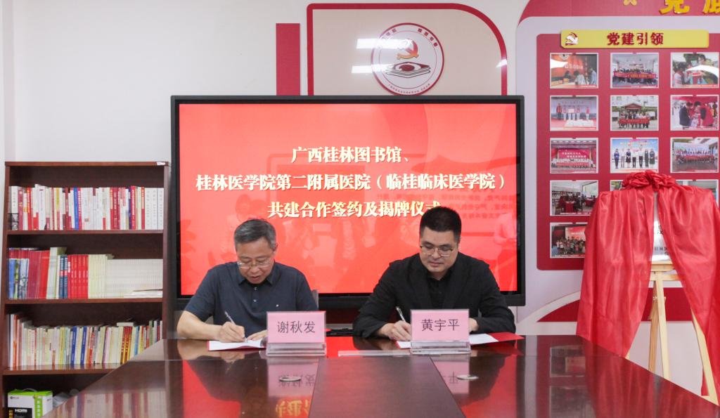 为充分发挥双方整体优势,深化协同合作,实现文化资源共享、党建经验互通、文化交流互融,共同打造公共文化和卫生医疗共建服务体系,4月18日下午,第二附属医院(临桂临床医学院)、广西桂林图书馆举行共建合作签约及揭牌仪式。第二附属医院(临桂临床医学院)党委副书记黄宇平以及学工办全体老师,广西桂林图书馆副馆长谢秋发以及借阅部、业务办、人事教育科等部门老师出席活动。