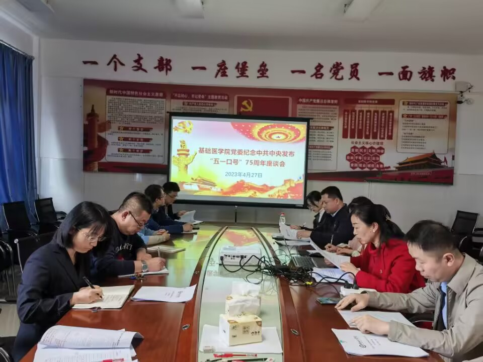 近日,基础医学院在党员之家召开纪念中共中央发布“五一口号”75周年座谈会。会议由学院党委书记朱开梅主持。基础医学院党委委员、党支部书记、九三学社社员代表、中国农工民主党党员代表、党外知识分子代表参加座谈会。