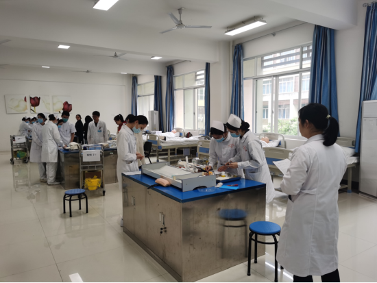 此次考核,由学院专任教师及桂林医学院第二附属医院共40名老师担任考官,其中大部分老师具有指导护理技能大赛的丰富经验。考核案例经过精心设计,紧密结合临床实际,模拟临床情境,涵盖内、外、妇产科、儿科、急救等多个学科共12项护理学基础操作及专科操作,要求护生在规定时间内依次对各站点病例进行病情评估、体格检查、技能操作、健康宣教等内容。考核结束,教师们分别对考场安排及学生考试过程中存在问题进行反馈,总结分析在实验教学中的薄弱环节和临床实践的培训方向。