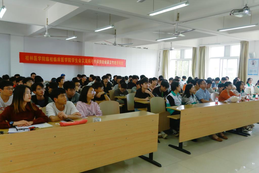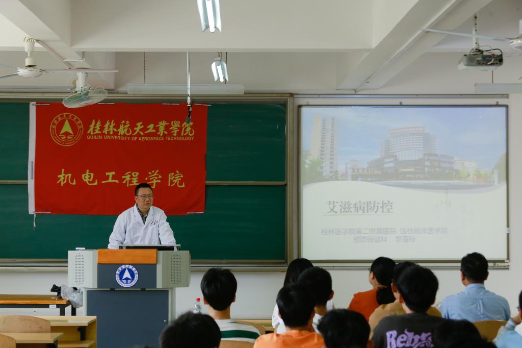 为提高大学生知艾防艾意识,遏制艾滋病在青年群体中的传播和流行,学习借鉴兄弟院系“三全育人”综合改革工作成效,不断提升临桂临床医学院“三全育人”综合改革工作水平和建设质量,5月12日下午,临桂临床医学院赴桂林航天工业学院机电工程学院开展防艾知识宣讲及参观交流活动。桂林航天工业学院学生工作部副部长刘飞、该校机电工程学院学工办老师以及80名学生,第二附属医院(临桂临床医学院)预防保健科科长黎雪桂、学工办全体老师以及20名医学生志愿者参与此次活动。