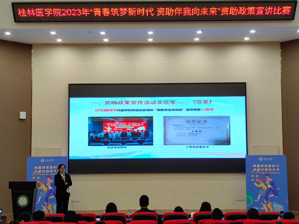 为进一步加大学生资助政策宣传力度,深化资助育人功能,学校于5月16日下午在国际教育学院报告厅举办“青春筑梦新时代,资助伴我向未来”资助政策宣讲比赛,本次活动由学生工作部(处)主办、基础医学院承办。学生工作部(处)副部(处)长伍言锋、学生资助管理中心主任、校团委社团部副部长出席本次比赛并担任评委,各院系师生代表150余人参加活动。