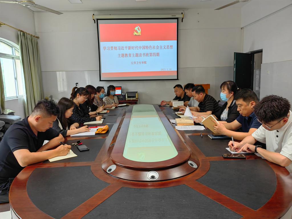 5月18日,公共卫生学院在学院212会议室举行学习贯彻习近平新时代中国特色社会主义思想主题教育读书班(第四次)专题学习。学院党政领导、党委委员、全体师生党支部书记等参加会议,会议由学院党委书记邓娜主持。