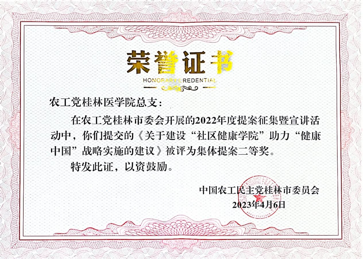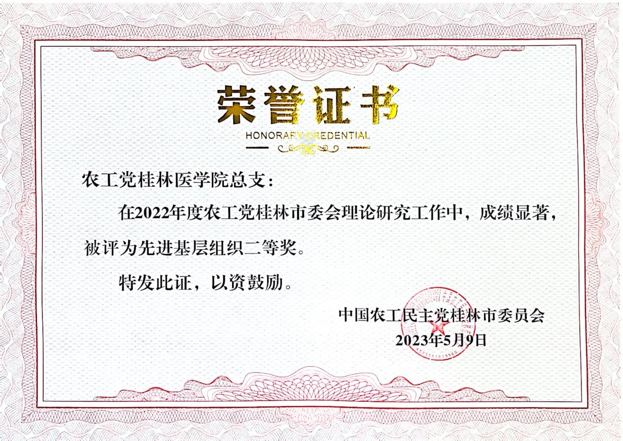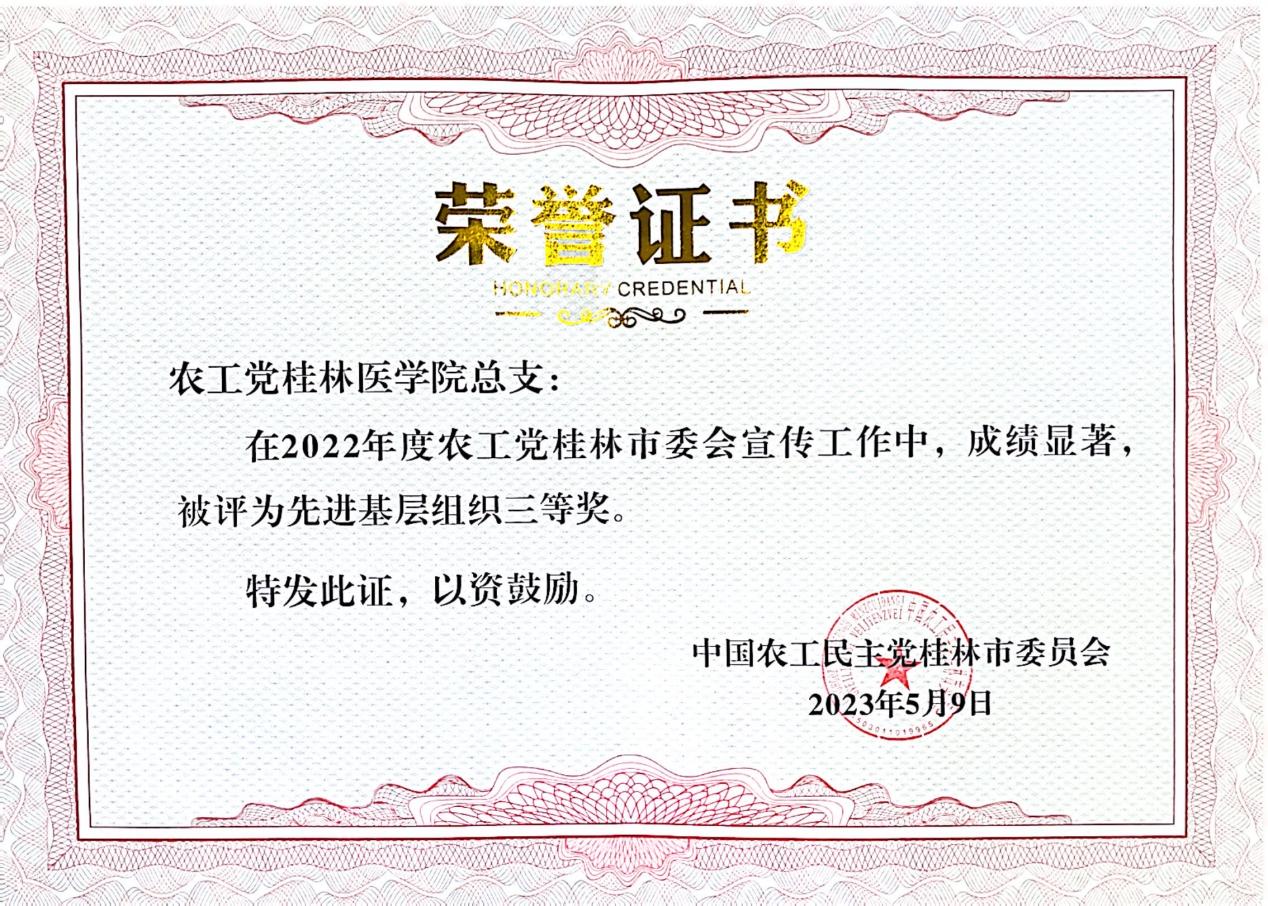 农工党桂林医学院总支在本次表彰中获得了多项集体和个人荣誉。在2022年度农工党桂林市委会理论研究工作及宣传工作中,桂林医学院总支被评为先进基层组织。在农工党市委会开展的2022年度提案征集暨宣讲活动中,桂林医学院总支提交的《关于建设“社区健康学院”助力“健康中国”战略实施的建议》获得集体提案二等奖。农工党员杨小丽、肖娟、覃惠迪在2022年度农工党桂林市委会理论研究工作中被评为先进个人。