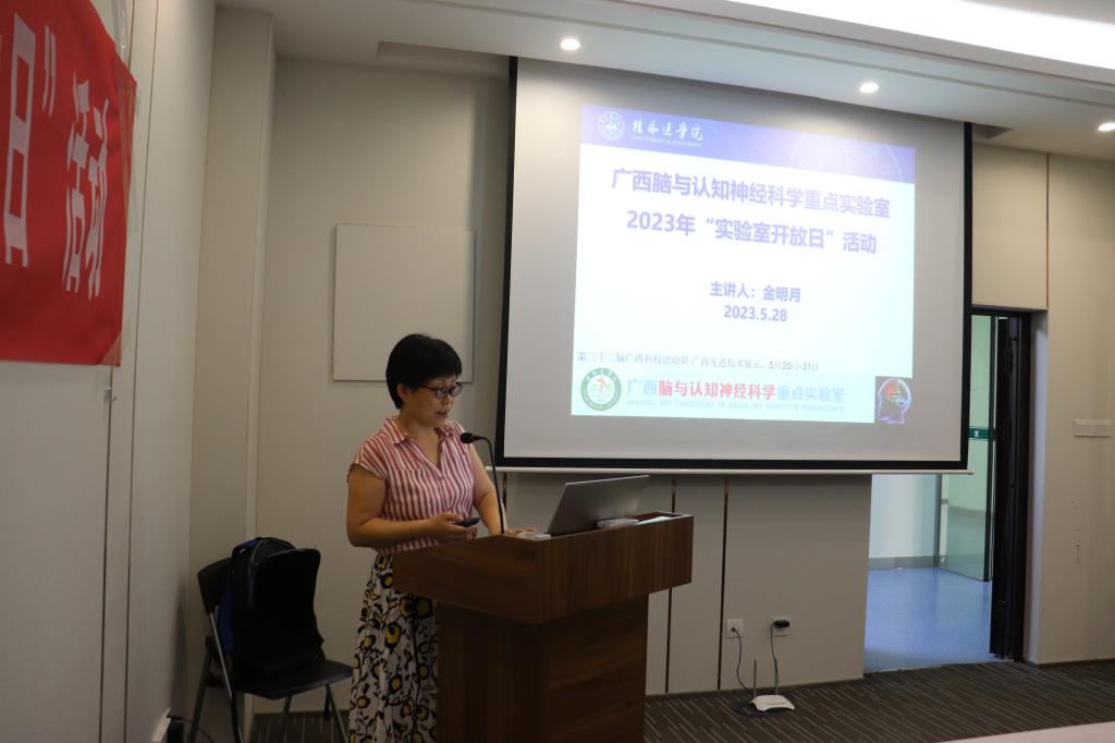 跨界、融合、交叉往往是科技创新的催生剂。5月28日下午,科普讲座活动由广西脑与认知神经科学重点实验室金明月研究员主持。她首先对大家的到来表示热烈的欢迎,会上金老师从大脑结构功能等方面给同学们作了详细介绍,尤其是认知能力方面的科普,通俗易懂的科普讲座大大激发了同学们对脑科学研究的兴趣;讲座还介绍了广西脑与认知神经科学重点实验室的发展历程、总体定位、主要研究方向、科研进展和平台建设总体情况,鼓励同学们勇敢走进不同学科领域探索,增强个人综合素质、增效个人本领,使自己成为具有社会责任感、科学素养的复合型人才;希望各位同学能通过本次活动“埋下一颗追求科学的种子”“踏上一个奋进创新的起点”“留下一份解密脑科学的梦想”。