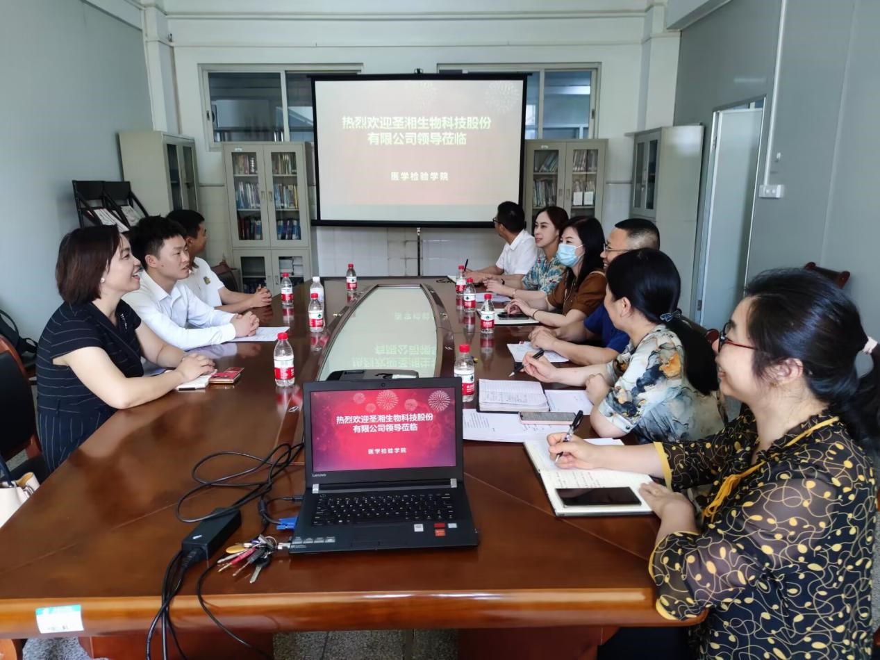 刘洪波对圣湘生物科技股份有限公司一行的到来表示热烈欢迎,并介绍了学院现状、专业设置、学生创新能力培养等方面的情况。接着,双方就毕业生就业招聘、学生实习基地建设、产学研具体合作方向和形式、奖学金设置、专业竞赛等方面进行深入交流和探讨,并达成进一步合作共识。