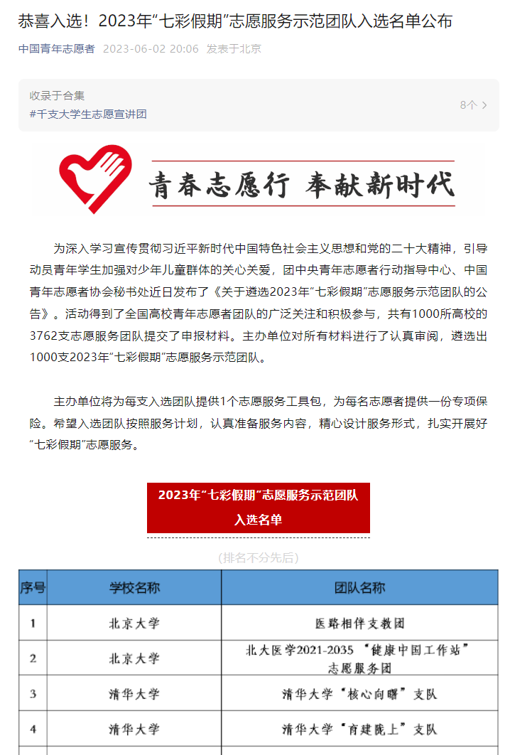 近日,团中央青年志愿者行动指导中心、中国青年志愿者协会秘书处公布2023年“七彩假期”志愿服务示范团队,口腔医学院“爱在山水间”志愿服务队作为学校唯一队伍入选。