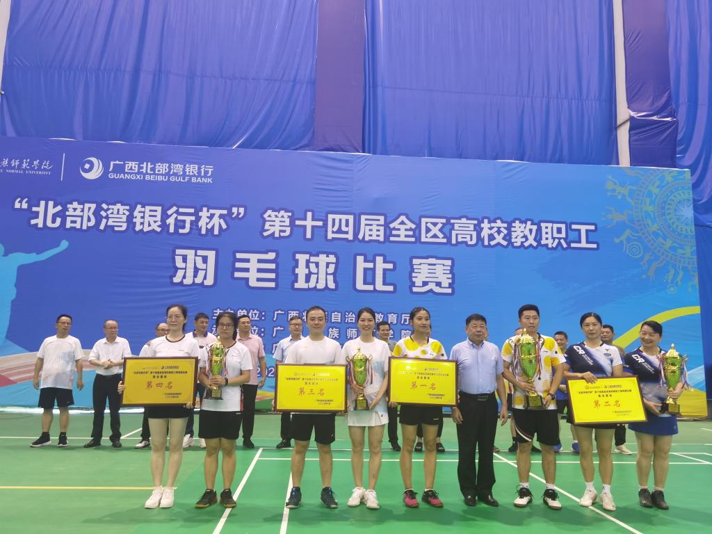 2023年6月1日至3日,第十四届全区高校教职工羽毛球赛在广西民族师范学院举行。我校派出13名教职工参加本次比赛。本次比赛共有48所本专科院校、640名运动员参赛。