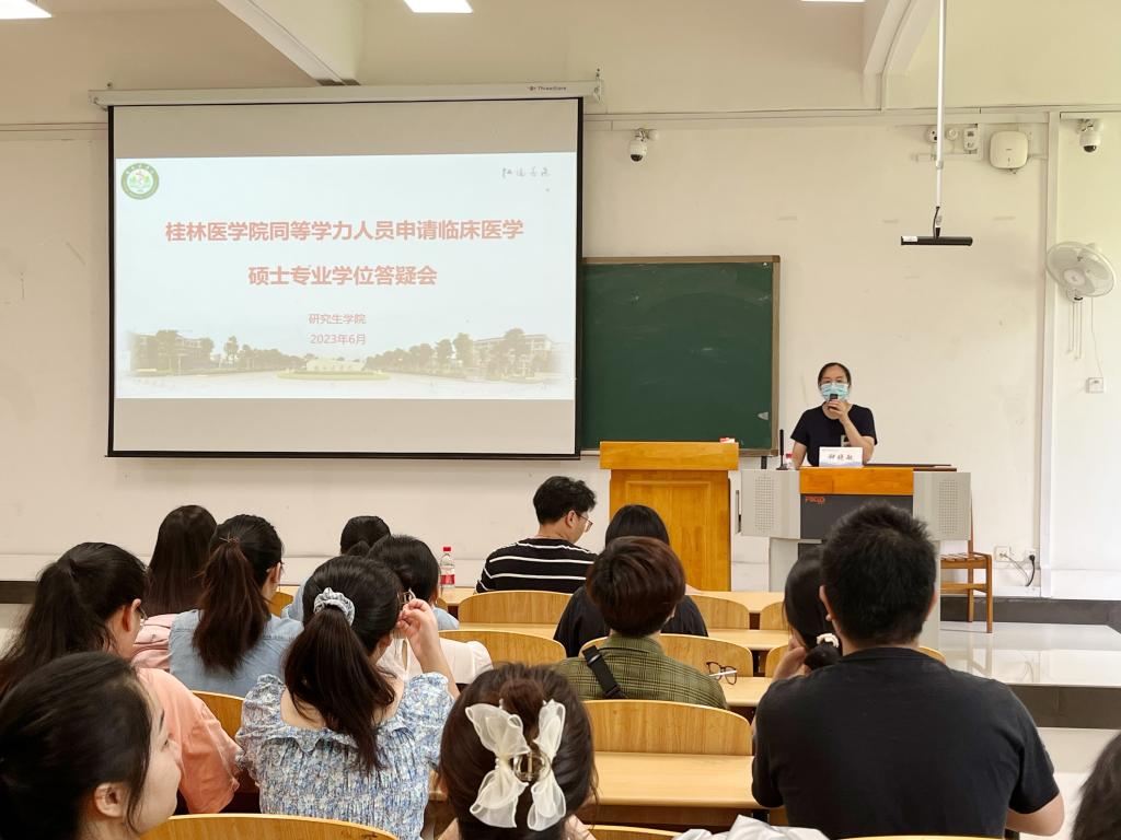 钟晓敏从什么是同等学力申硕、申硕报考条件、报考流程、报考难度、收费标准等方面进行讲解。她提到,结合我校目前的报考情况来看,报考人数逐年增多,越来越多的人将选择同等学力这条道路来提升自身的能力。她鼓励大家积极报考,努力锤炼本领,为将来服务基层作出更大贡献。最后,她希望大家能够抓住未来规培三年的大好时光,做好学习工作计划,珍惜来之不易的求学机会,做到学以致用,力争成为基层高质量发展人才。