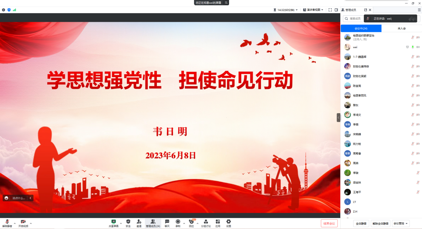 为进一步深化学习贯彻习近平新时代中国特色社会主义思想主题教育的理论学习,根据学校主题教育工作要求,6月8日晚上,学校党委组织部常务副部长、机关党委书记韦日明依托腾讯会议在线上以“学思想强党性担使命见行动”为题讲授主题教育专题党课。组织部党支部、财务处党支部和人事处、人才办党支部全体党员参加党课。