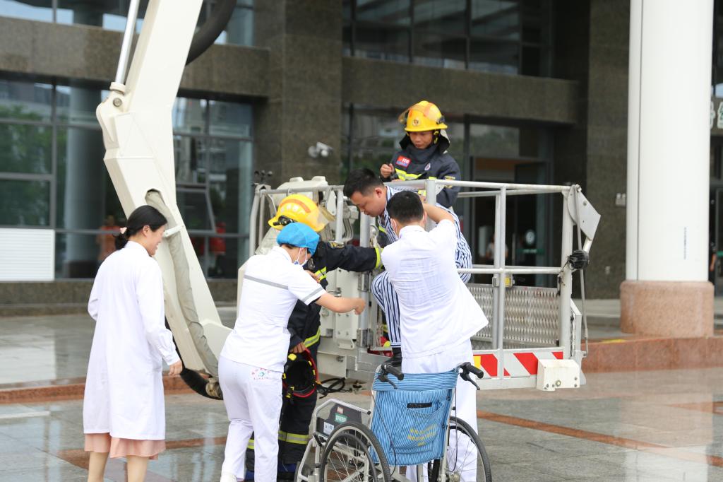 当天演练从10号综合楼六层肾内科病房突发火灾后消防控制系统报警为切入点,随即紧急启动消防预案和应急广播系统,并拨打119火警电话,医护人员在做好自身及患者防护的前提下紧急疏散患者从安全出口有序撤离,救护车在安全出口待命随时转运患者及陪护人员至安全地带。