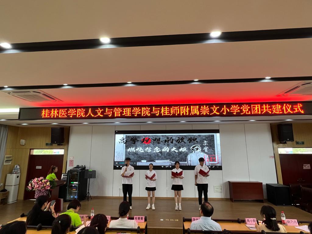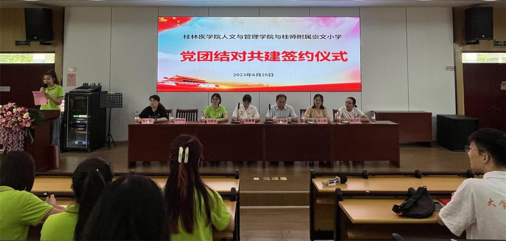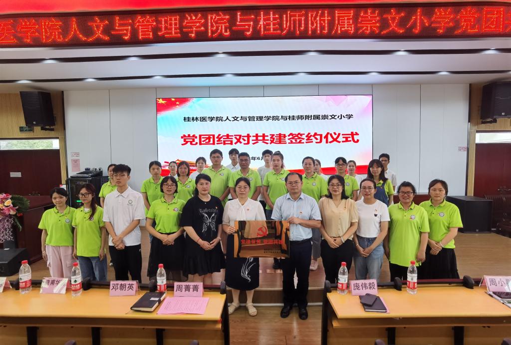 6月25日下午,人文与管理学院与桂林师范高等专科附属崇文小学举行党团共建合作签约及揭牌仪式。人文与管理学院党委书记庞伟毅,党委副书记、纪委书记周小群及团委老师,桂师附属崇文小学校长周菁菁、副校长邓朝英及全体党员出席此次活动。