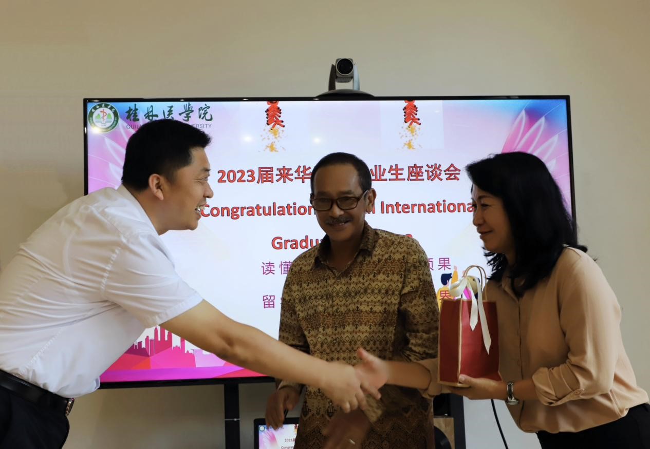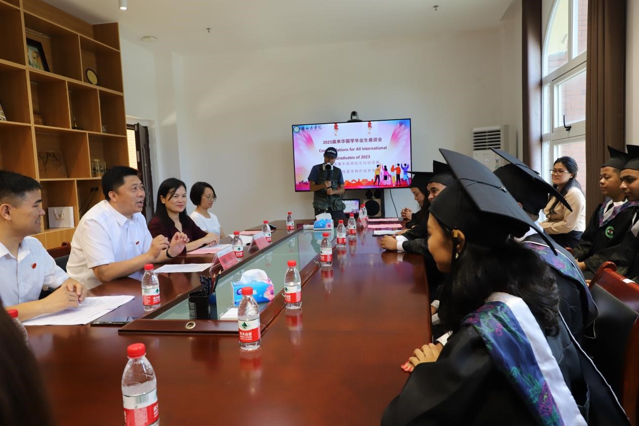 读懂中国,感知文化结硕果;留学桂医,学有所成奔世界。在这个绚烂的夏天,我校2023届来华留学生迎来了他们的毕业时刻。6月27日上午,国际教育学院在国际教育交流中心S102会议室召开桂林医学院2023届来华留学毕业生座谈会。留学生、校友代表、家长代表、国际教育学院领导班子及有关工作人员参加会议,会议由国际教育学院副院长覃涛主持。