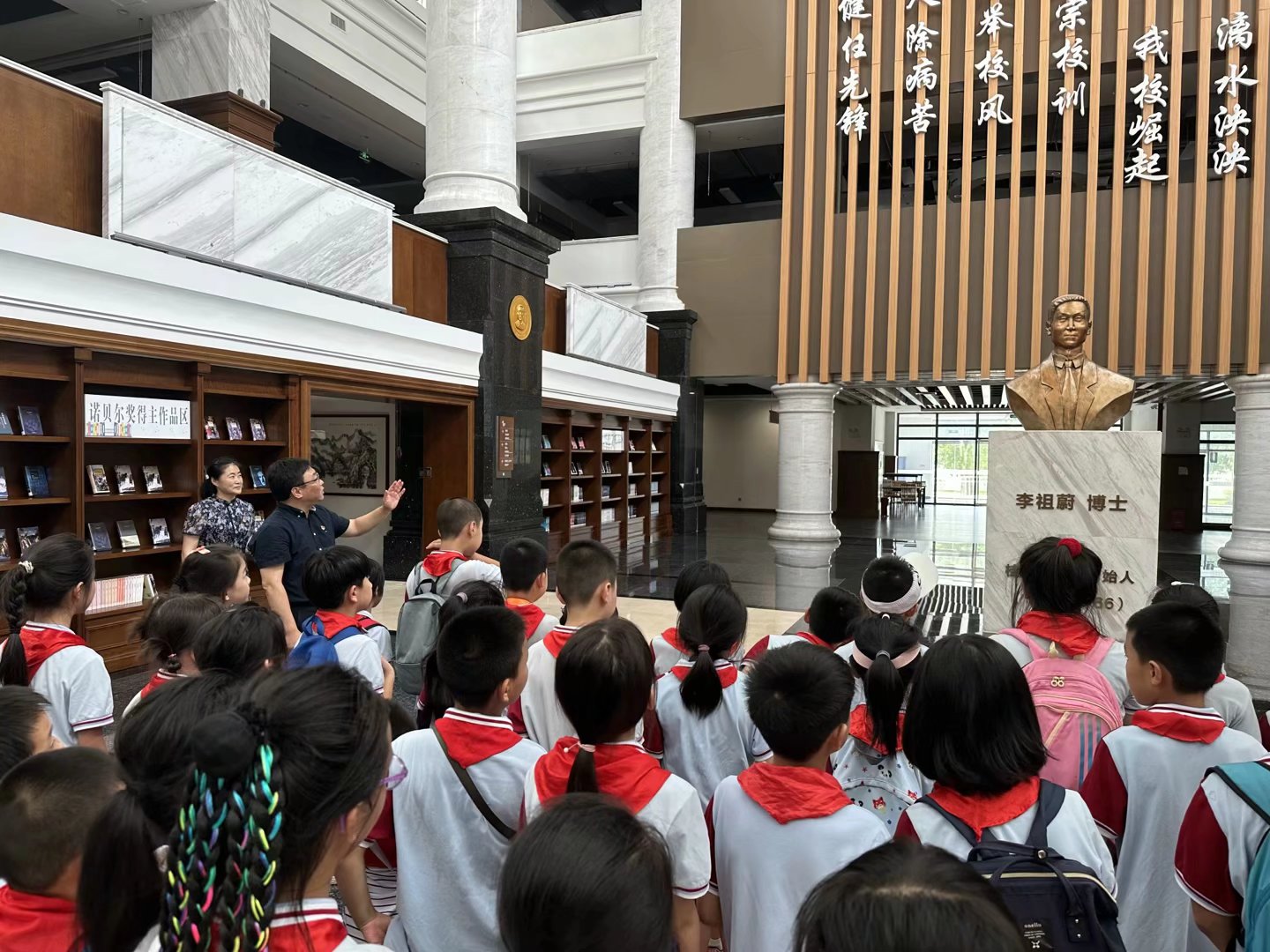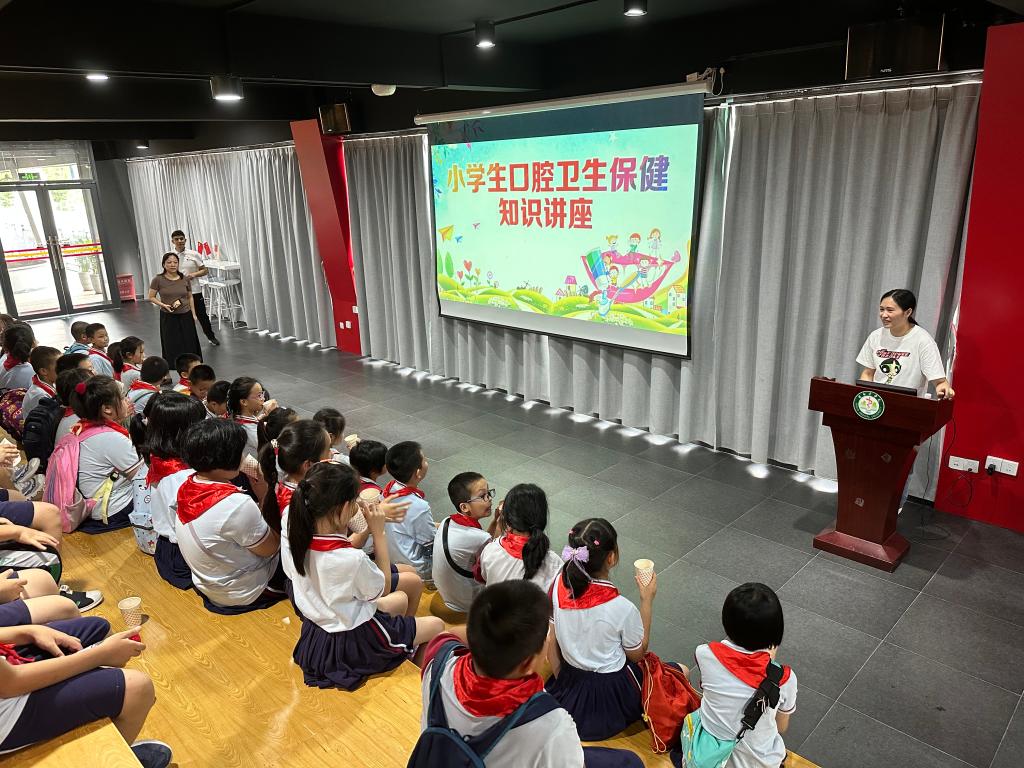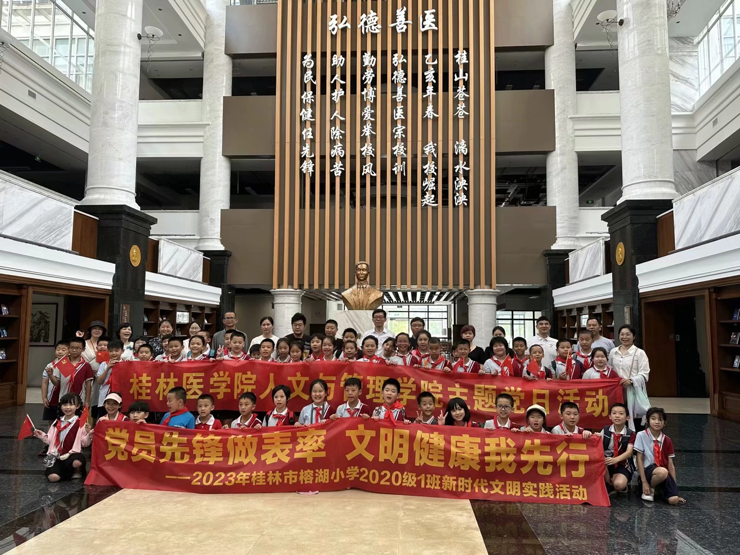 7月7日下午,人文与管理学院教工党支部、图书馆党支部、信息中心党支部与榕湖小学联合开展党员志愿者服务活动。在蒋巾晖老师和4名党员家委们的带领下,48名少先队员们怀着激动的心情,兴致勃勃地走进桂林医学院临桂校区,开启了大学校园半日游的参观活动。活动旨在让孩子们近距离接触大学校园,感受大学生活及校园党建文化,学习健康保健知识,为幼小的心灵注入一道理想之光。