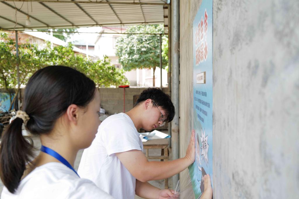 志愿者在乡村张贴防溺水安全教育海报