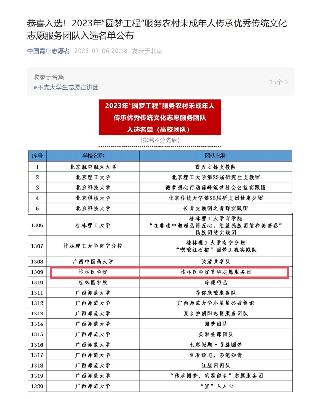 为进一步加强中西部地区农村未成年人思想引领,大力弘扬中华优秀传统文化,铸牢中华民族共同体意识,中央文明办三局、团中央青年志愿者行动指导中心、中国青年志愿者协会秘书处共同开展2023年“圆梦工程”服务农村未成年人传承优秀传统文化志愿服务项目,遴选出2000支志愿服务团队。我校共两支团队入选,临桂临床医学院菁华志愿服务团是其中之一。