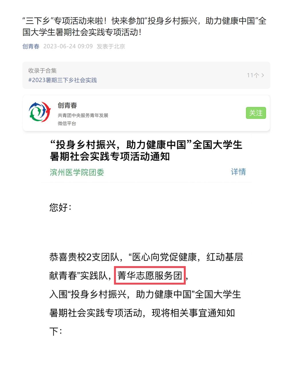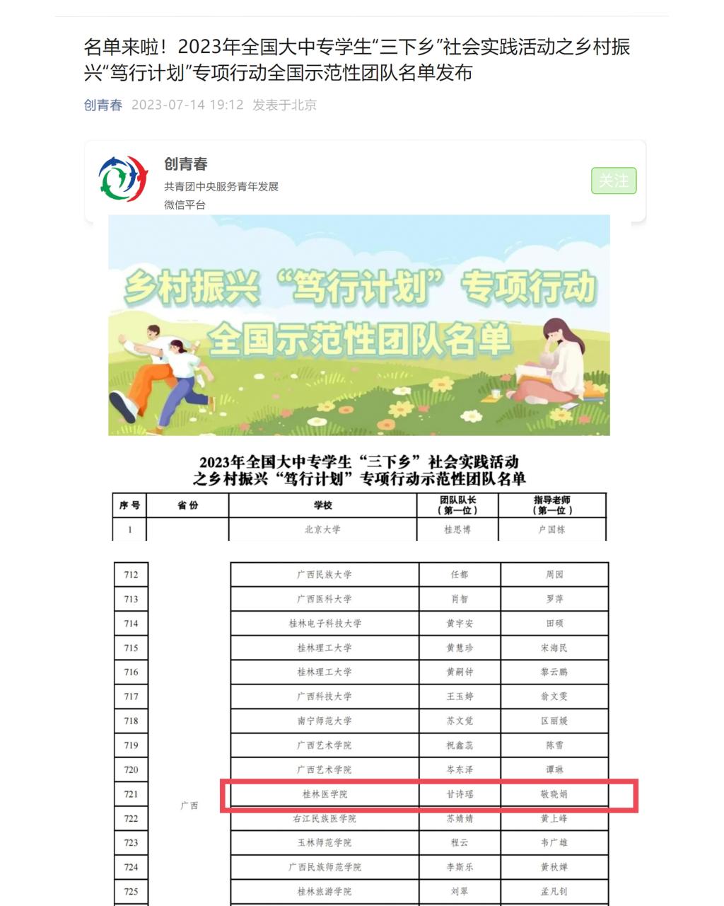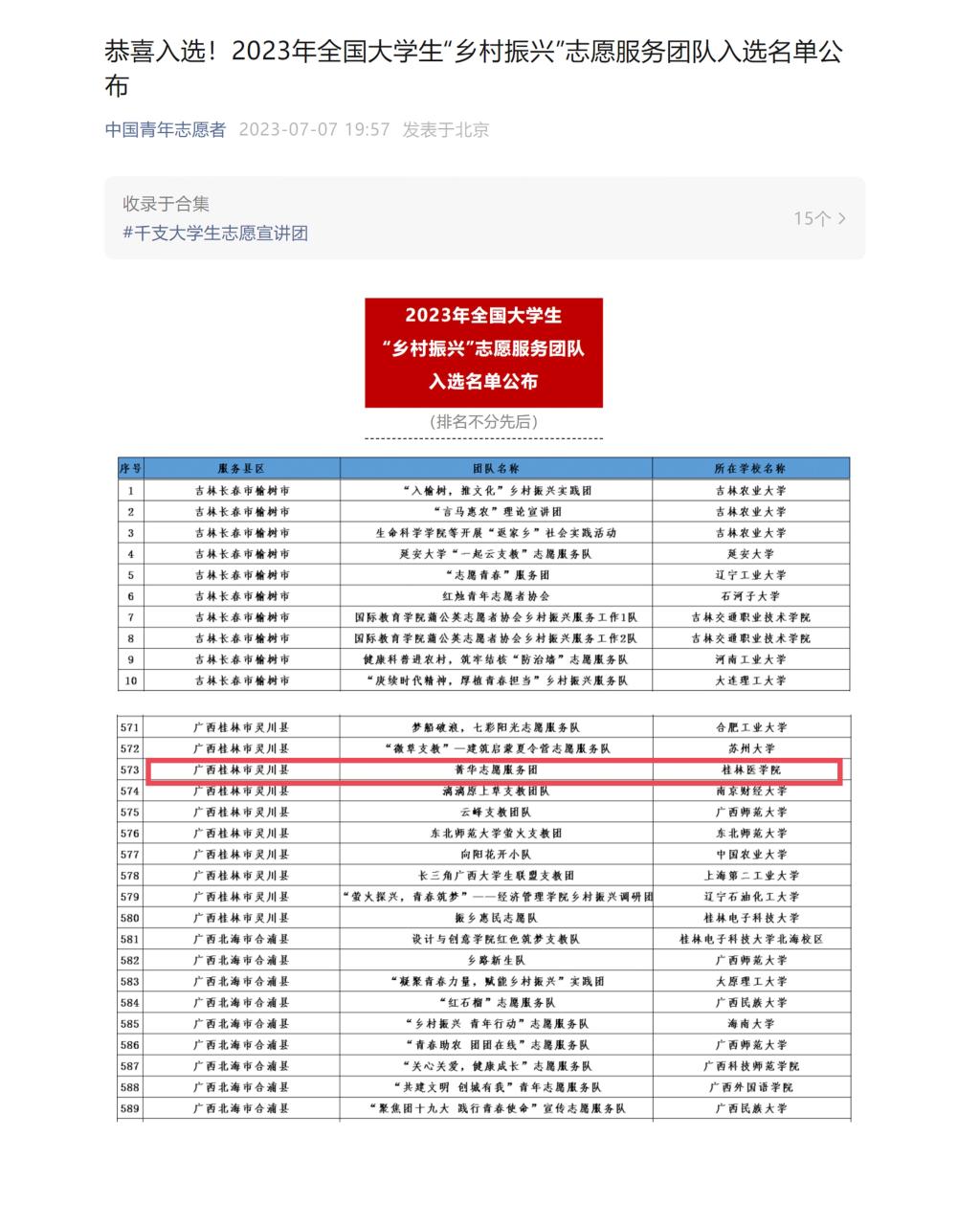 根据《关于开展2023年全国大中专学生志愿者暑期文化科技卫生“三下乡”社会实践活动的通知》有关要求,共青团中央青年发展部决定在全国范围内组织开展2023年全国大中专学生“三下乡”社会实践活动之乡村振兴“笃行计划”专项行动,评选出1000支全国性示范实践团队。临桂临床医学院菁华志愿服务团作为学校唯一入选团队。