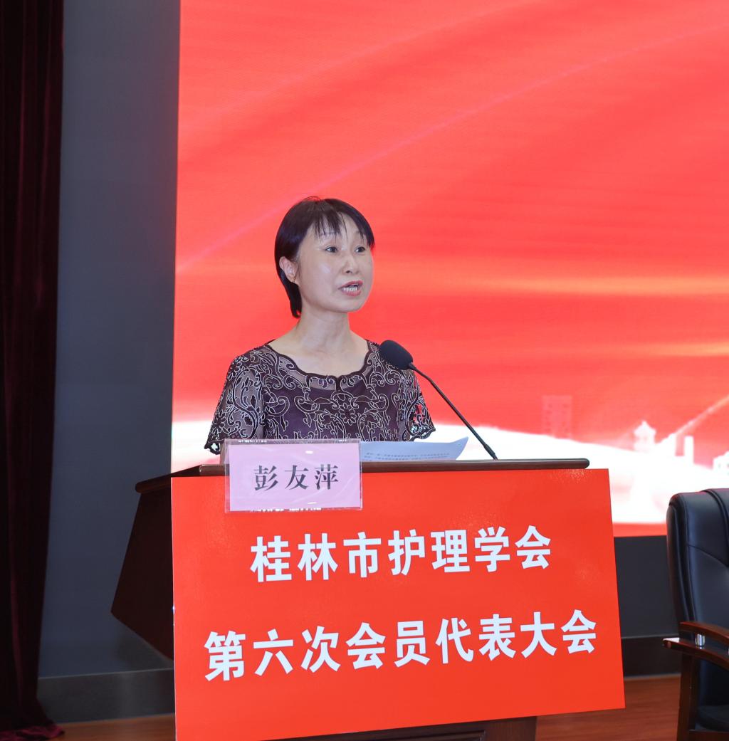 桂林市科协副主席彭友萍致辞。她表示,桂林市护理学会成立以来,在举办学术交流、组织继续教育培训、开展卫生宣教和科学普及、推广创新方法等方面做了大量卓有成效的工作,在联系政府、医疗机构、护士、企业之间起到了良好的桥梁和纽带作用。对做好新形势下的学会工作,她提出了四点希望:一是坚持党建强会,团结引领广大会员坚定不移听党话、跟党走。二是坚持学术立会,搭建高水平交流平台服务经济社会发展。三是坚持服务兴会,助力行业发展。四是加强自身建设,增强服务能力,努力建设一流学会。她期待新一届理事会班子,能够继续团结凝聚好广大护理科技工作者,不忘初心、开拓创新、锐意进取,推动我市护理事业再上新台阶。桂林市科协也将站在学习贯彻好党的二十大精神、落实科协“四服务”职能的高度,发挥好党和政府联系科技工作者桥梁纽带的作用,做好相关协调、服务,为学会创新发展履行好业务主管单位职责。