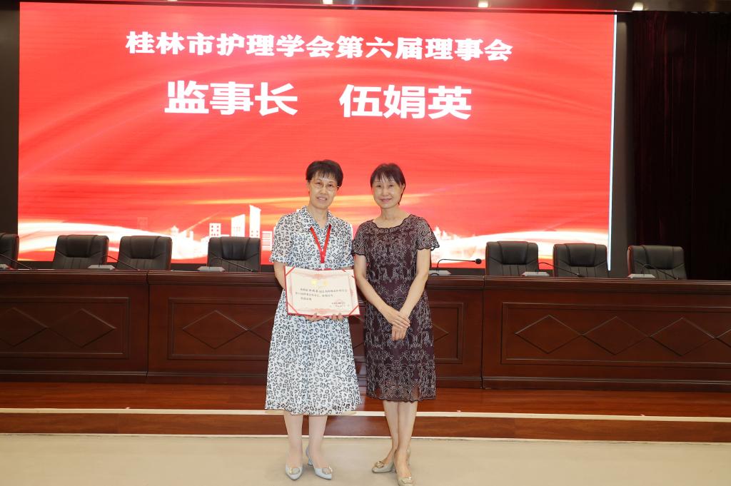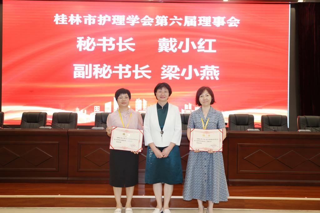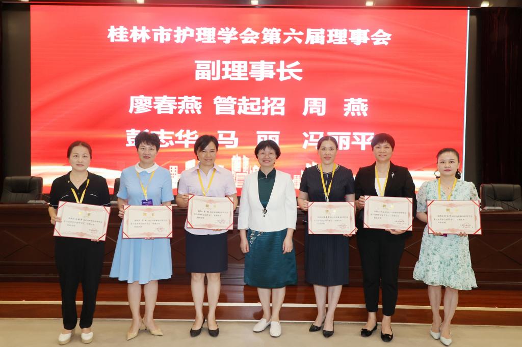 此次会议上,全体代表审议通过了《桂林市护理学会第六届理事会理事选举办法》《桂林市护理学会第六届理事会常务理事、秘书长、副理事长、理事长选举办法》《桂林市护理学会监事会选举办法》,选举产生了桂林市护理学会第六届理事会理事,桂林市护理学会监事会监事,第六届常务理事,第六届理事长、副理事长、秘书长、副秘书长和监事长。桂林医学院附属口腔医院党委书记文琼仙当选桂林市护理学会第六届理事会理事长,廖春燕、管起招、周燕、彭志华、马丽、冯丽平当选副理事长,戴小红任秘书长,梁小燕任副秘书长。彭友萍为新当选的理事长、监事长颁发证书,文琼仙为副理事长、秘书长、副秘书长颁发证书。