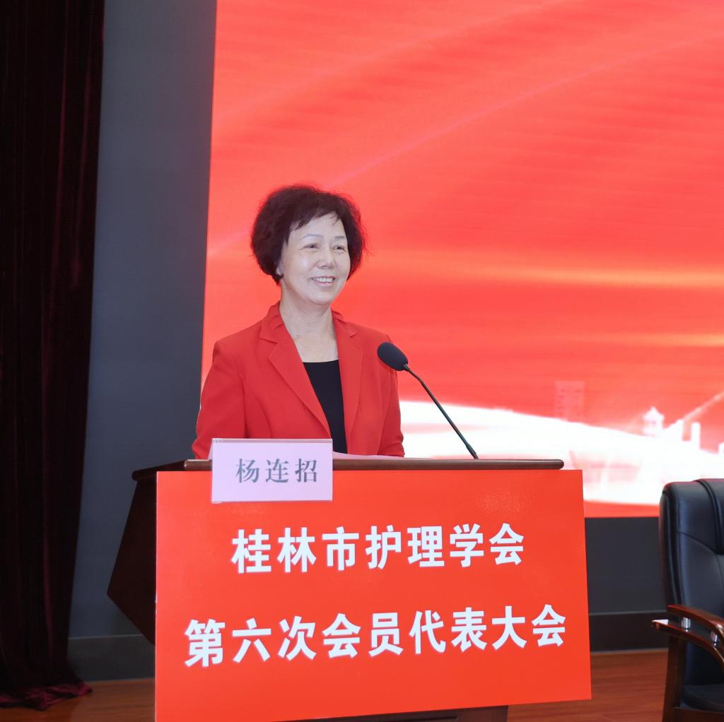 广西护理学会理事长杨连招对此次会议的成功举办表示祝贺,她在致辞中表示,桂林市护理学会的工作对桂林护理学界意义重大。本次大会的召开,有利于进一步加强桂林护理学会组织建设和规范化建设,对学会今后的可持续发展具有重要意义。她对学会今后的发展提出几点希望:一是服务大局,明确目标。将护理工作的发展融入健康中国建设、服务经济社会发展全局中。二是要清晰定位,引领行业。作为桂林市护理行业的领头雁,桂林市护理学会继续团结带领全市护理工作者提升护理学科建设,搭建多学科交叉融合的护理学术平台,三是因时顺势,创新驱动。她希望,新一届理事会能百尺竿头更进一步,坚持守正创新,切实提高地区间、机构间护理同质化水平,积极优化护理资源布局,开展专业化、人性化、全周期护理工作,全面推动桂林乃至全区护理事业发展,为人民健康做出更大贡献。