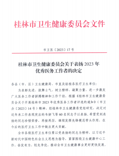 为进一步弘扬医护工作者敬佑生命、救死扶伤、甘于奉献、大爱无疆的卫生健康崇高精神,树立典型,弘扬正气,激励广大医务工作者以崇高的职业道德、精湛的医疗技术积极投身卫生健康事业,桂林市卫生健康委员会决定对近年来工作表现突出的同志授予优秀医务工作者荣誉称号,第二附属医院刘颖教授、姚红兵教授位列其中,获此殊荣。