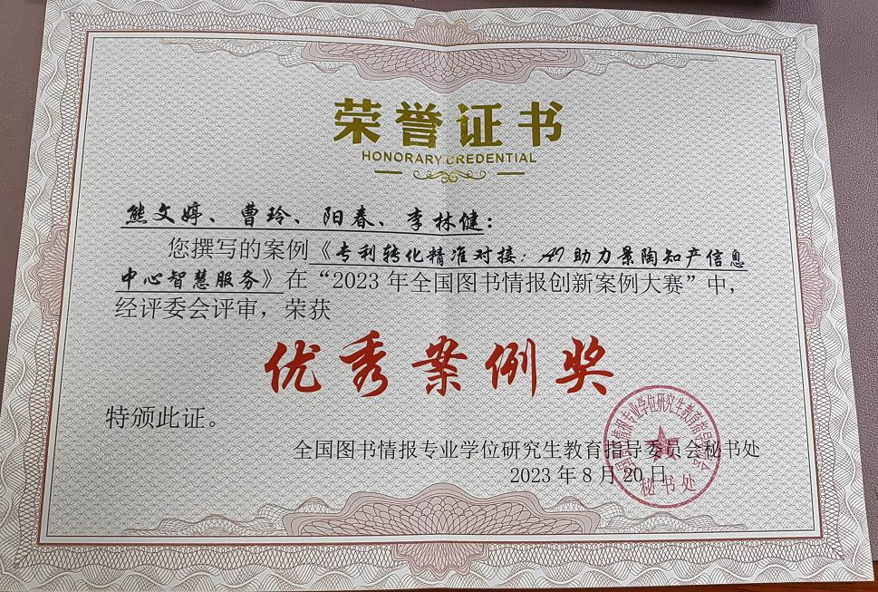 近日,我校图书馆首次参加全国图书情报案例大赛,与景德镇陶瓷大学、南京信息工程大学联合编写的教学案例《专利转化精准对接:AI助力景陶知产信息中心智慧服务》荣获大赛“优秀案例奖”。