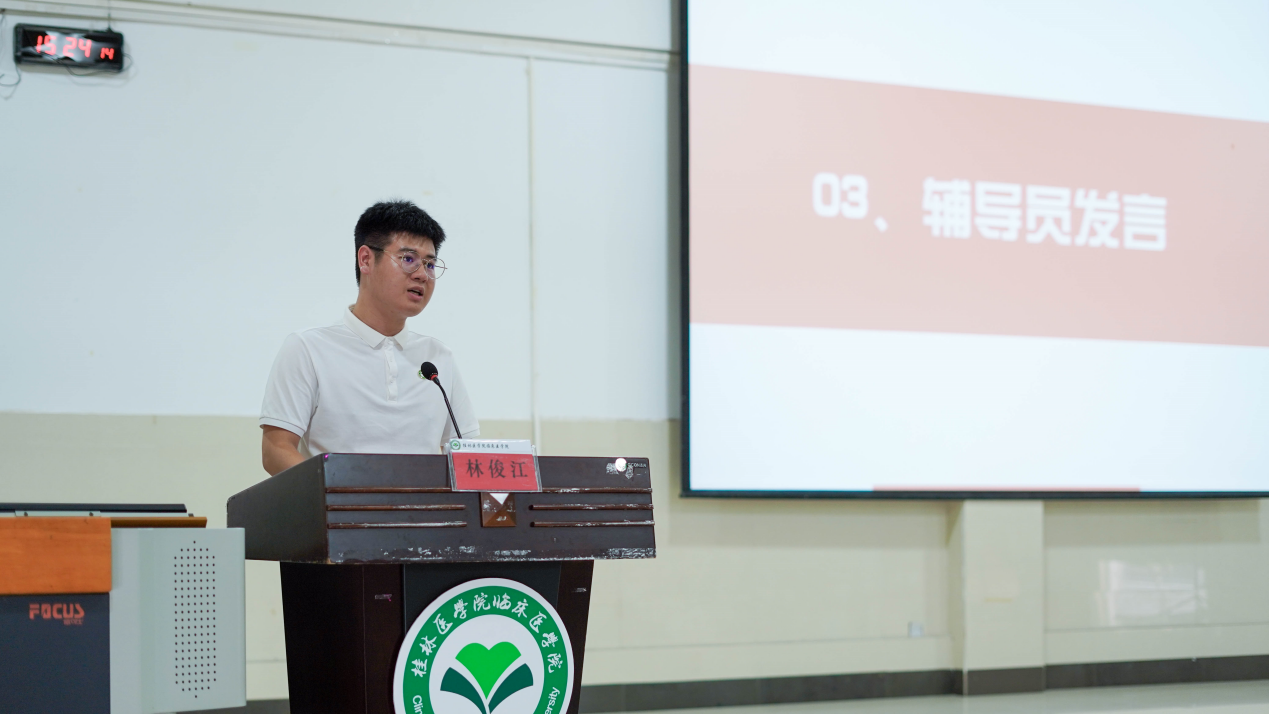辅导员林俊江、潘燕兰先后发言,他们为同学们的医学生涯提出展望,帮助新生们更好地适应大学生活。随后,新生家长代表张涛发言,他表达了对学校和老师们辛勤付出的肯定与感激,并希望孩子们能在大学期间不负老师与家长的期盼,更不负学校的期望,努力成为一名合格的医学生。