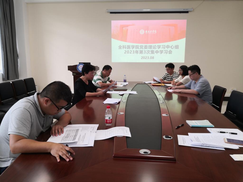 8月25日上午,全科医学院在学院211会议室召开学院党委理论学习中心组2023年第3次集中学习(扩大)会。会议由全科医学院党委副书记潘涛主持,全科医学院党政领导、专职组织员、党委委员、纪委委员参加会议。