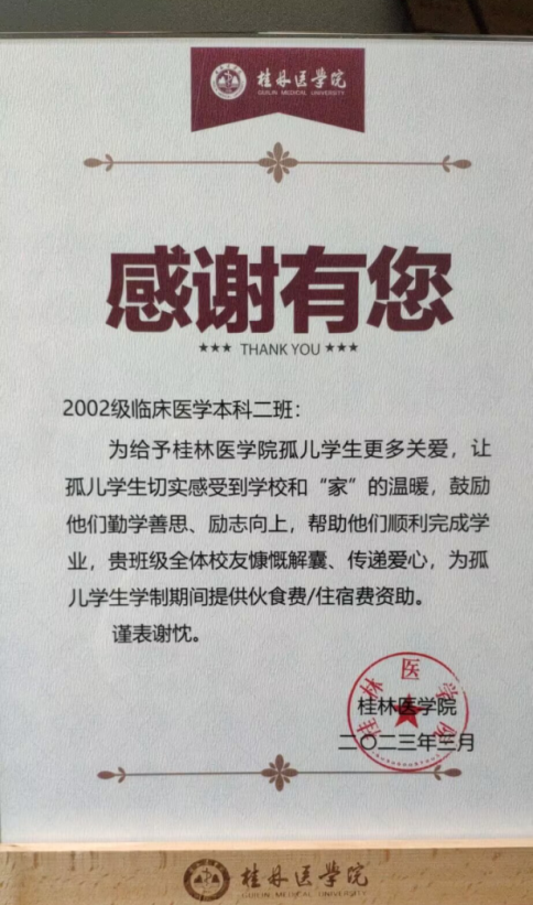 据悉,我校正处在发展的关键期,2002级临床医学本科班全体校友很关心母校的发展和学校学弟学妹的个人成长和发展,主动募捐6万元用于桂医“大道.不孤”临床医学专业孤儿“食不愁”奖助学金设立,为母校建设凝心聚力贡献微博力量,该奖学金是学校第一个以班级名义设立的奖助学金。