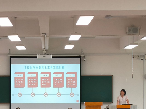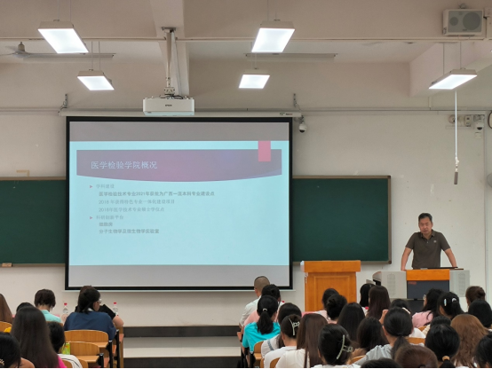 活动伊始,李云秋以“树立远大梦想,绽放青春光彩”为主题展开入学教育,详细介绍了学校和学院的发展历程,对同学们提出“树立远大理想,明确发展目标,尽快适应环境,遵守校规校纪,强化专业学习,提高综合素质”六点要求,希望同学们做有理想、敢担当、能吃苦、肯奋斗的新时代好青年。刘洪波对医学检验学院的现状以及教学改革、校企协同育人、人才培养等方面作了详细介绍,同时对同学们提出了期望,他希望同学们牢记“弘德善医”的校训,肩负起健康中国建设的使命担当,早日成为一名合格的医者。黄晨结合党的二十大精神,以“学习党史 端正入党动机”为题开展入党启蒙教育,并号召新生加强理想信念,积极向党组织靠拢,与祖国在新时代共同成长。尹铁球围绕培养方案和培养过程管理进行了详细宣讲。