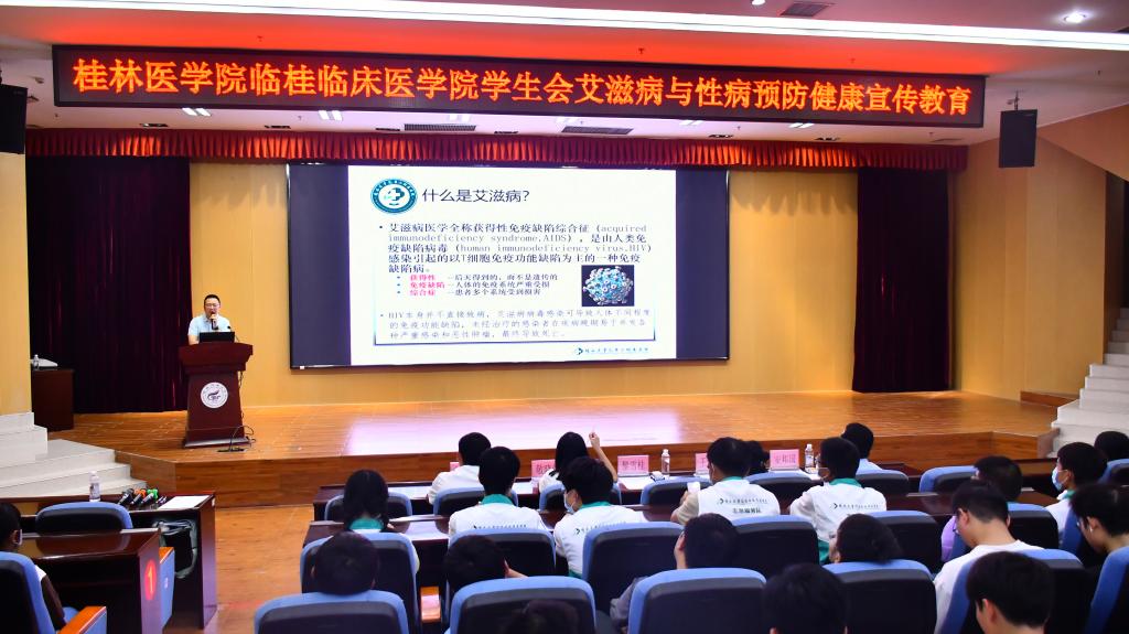 第二附属医院(临桂临床医学院)预防保健科科长黎雪桂以“艾滋病防控”为主题进行知识宣讲。他结合真实案例,就艾滋病的流行概况、传播途径、预防与控制等三个方面进行详细讲解,教导同学如何预防和看待艾滋病及艾滋病患者,使同学们正视、关注、有效预防艾滋病,养成健康的生活方式。随后,医学生志愿者对如何预防艾滋病进行了讲解、演示,提高同学们的防护意识。