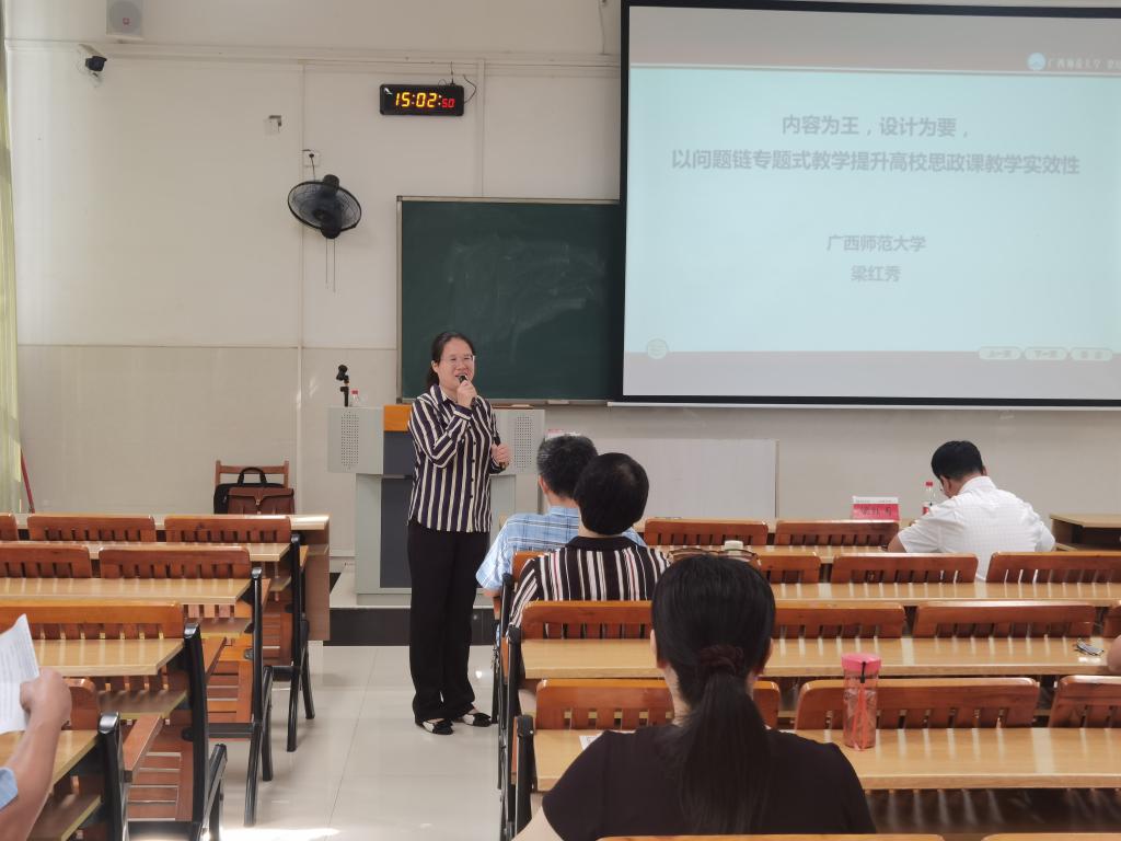 为进一步推动思政课守正创新,提升广大思政课教师的教学能力,9月19日下午,马克思主义学院邀请广西师范大学马克思主义学院梁红秀博士来学院开展主题为“内容为王,设计为要,以问题链专题式教学提升高校思政课教学实效性”的教学专题讲座,全体思政课教师参加培训。