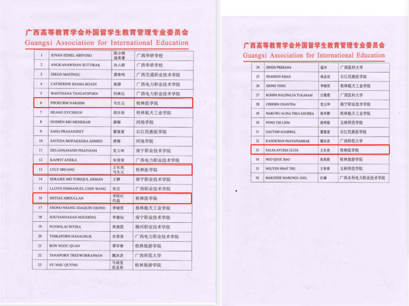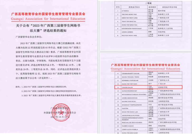 10月23日,广西高等教育学会外国留学生教育管理专业委员会(广西留管学会)公布“2023年广西第三届留学生网络书法大赛”结果,我校留学生CHANN DALIN(侯丽玲)荣获二等奖,学生PHOEURM NAKHIM(潘娜琪)、SREANG LYLY(李莉)、IMTIAZ ABDULLAH(王知合)、SALSA AYUDIA ULITA(李诗悦)分别荣获三等奖。