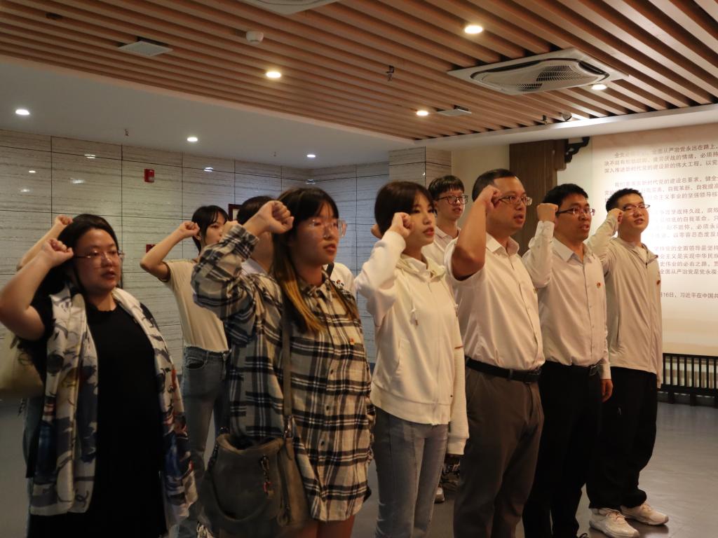 最后,在宣誓厅里,参观学习的党员同志肃立在党旗前,庄严举起右手宣誓,重温入党誓词。