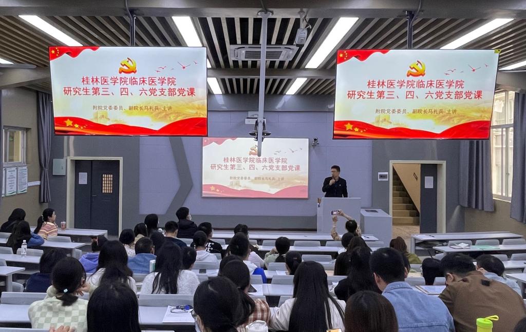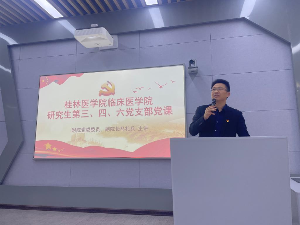 为深入学习贯彻党的二十大精神,加强研究生党员思政教育,坚定研究生党员理想信念,切实提高研究生党员的政治素养和理论水平,近日,附属医院党委委员、副院长马礼兵在乐群校区T5教室为临床医学院研究生第三党支部、研究生第四党支部、研究生第六党支部党员研究生们上主题党课。